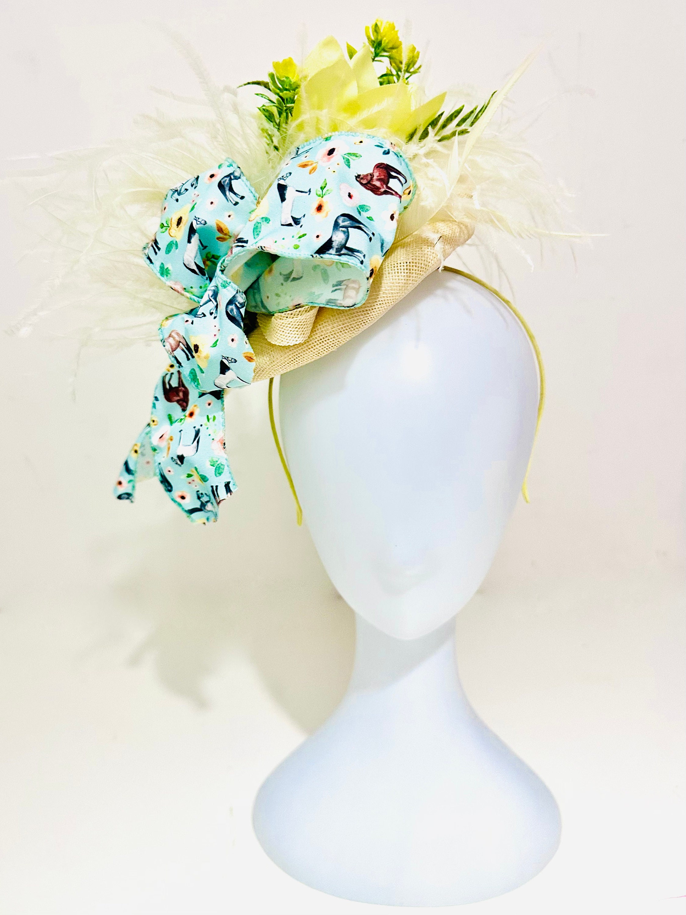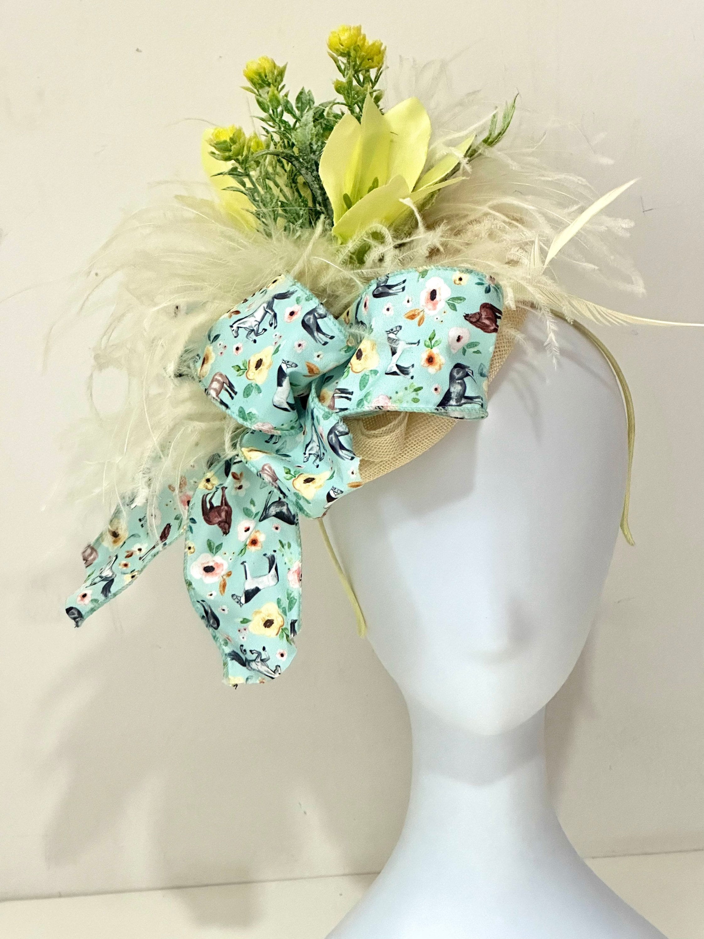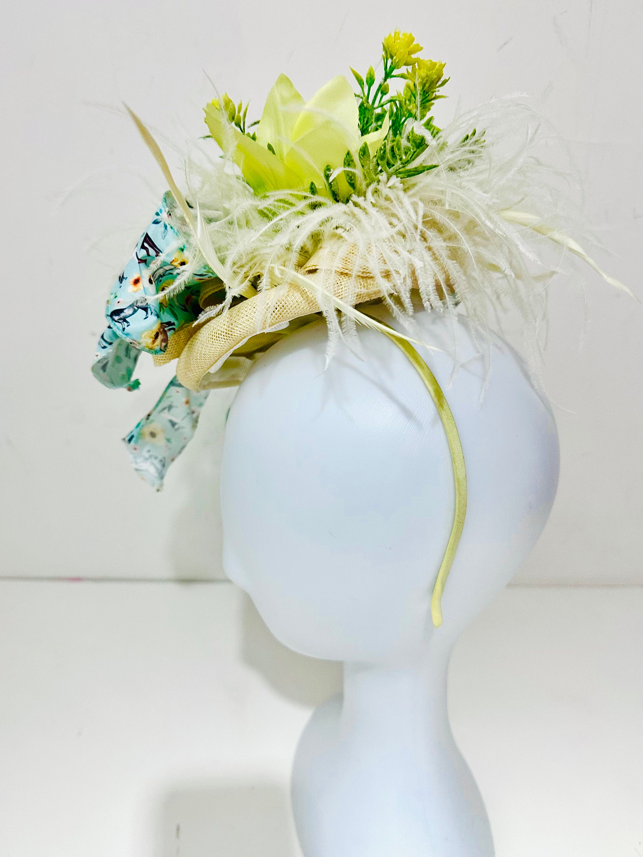 Light Blue Cotton Flowers and Horse Ribbon Bow with Ivory Marabou Ostrich Feather on a Soft Ivory Yellow Hat Headband