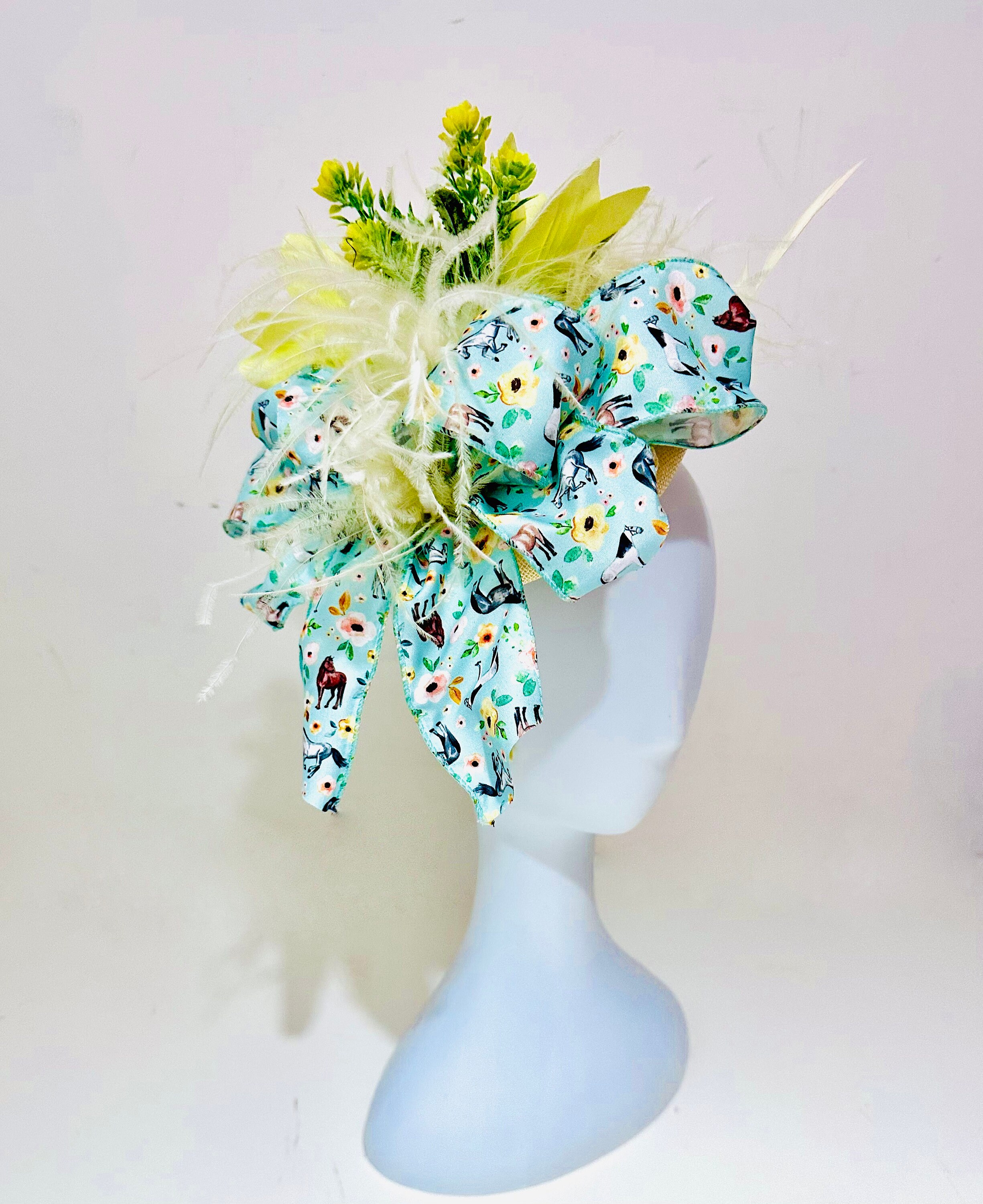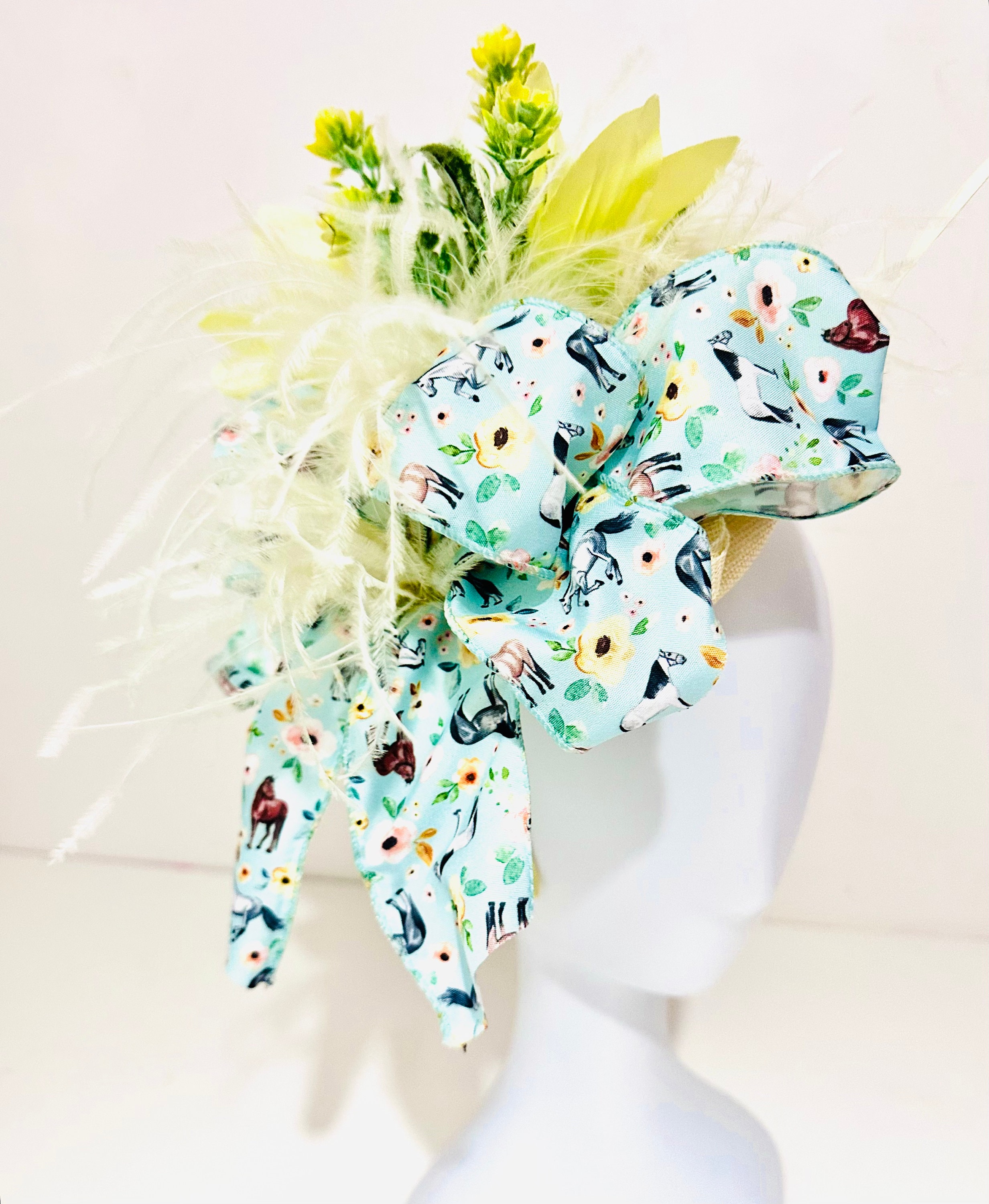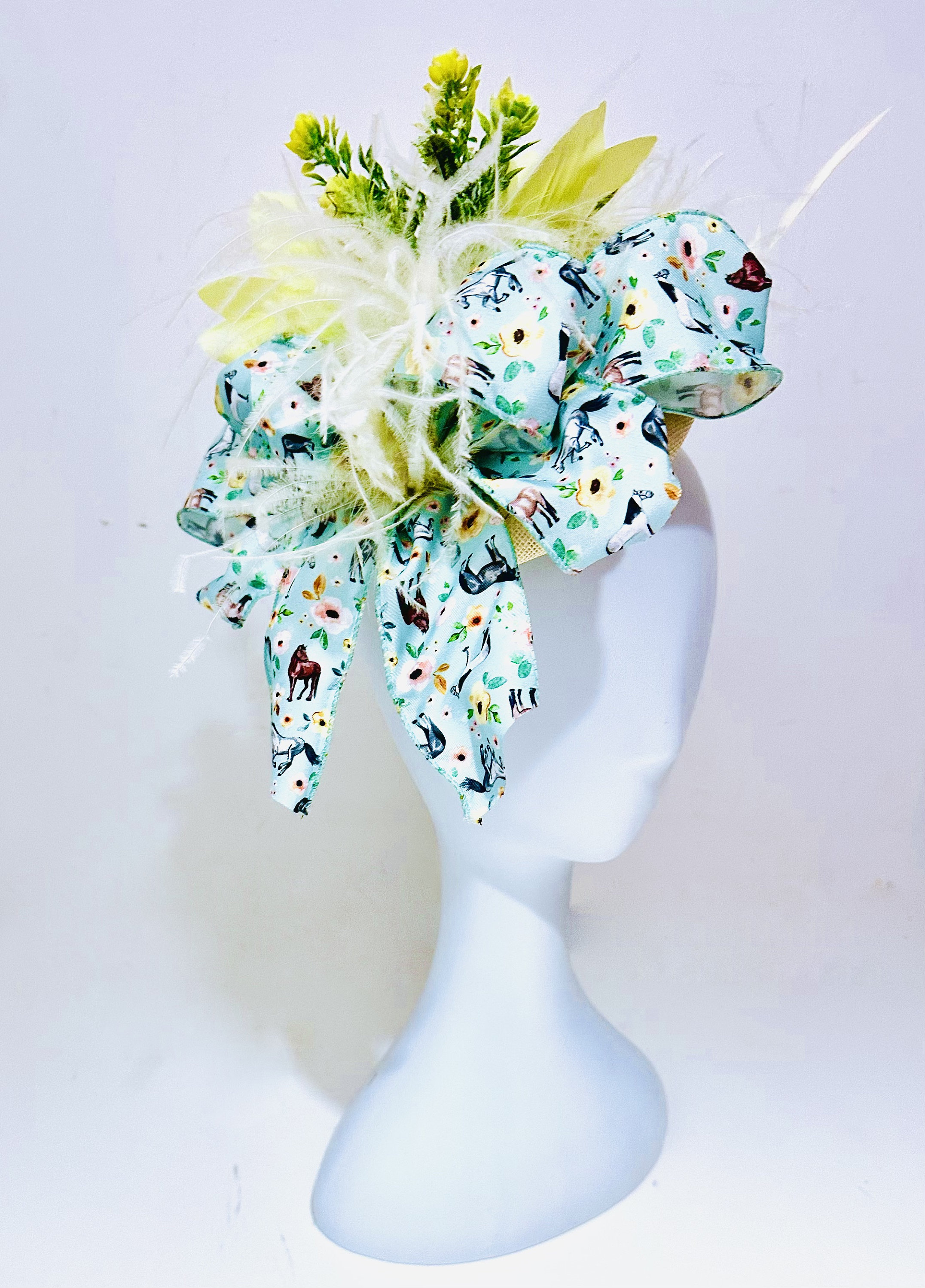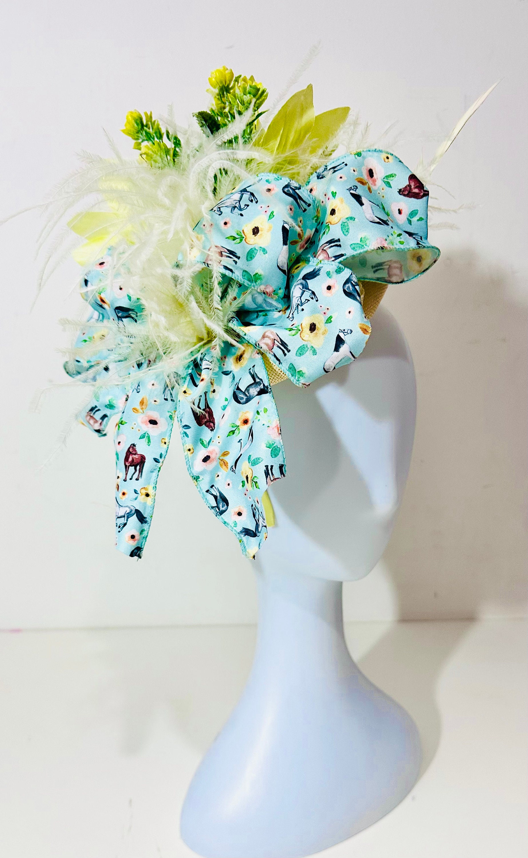 Light Blue Cotton Flowers and Horse Ribbon Bow with Ivory Marabou Ostrich Feather on a Soft Ivory Yellow Hat Headband