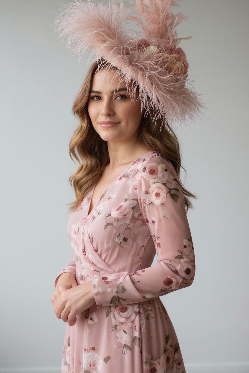 Champagne Blush Dusty Rose Feathers, Blush Pink Peony Flower Derby Hat,