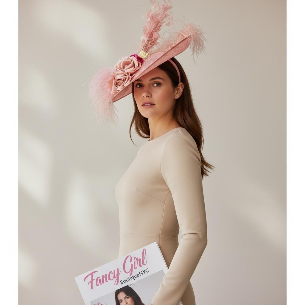 Beautiful Double sided Hat, Double Dusty Blush Pink Roses, Rose Pink, Ivory Flowers with Dusty Rose Veil and Dusty Rose Srtiped Coque Feathers, with Light Dusty Rose Marabou Ostrich Feather on a Dusty Pink Large Sinamay Saucer Texture Linen like Hat