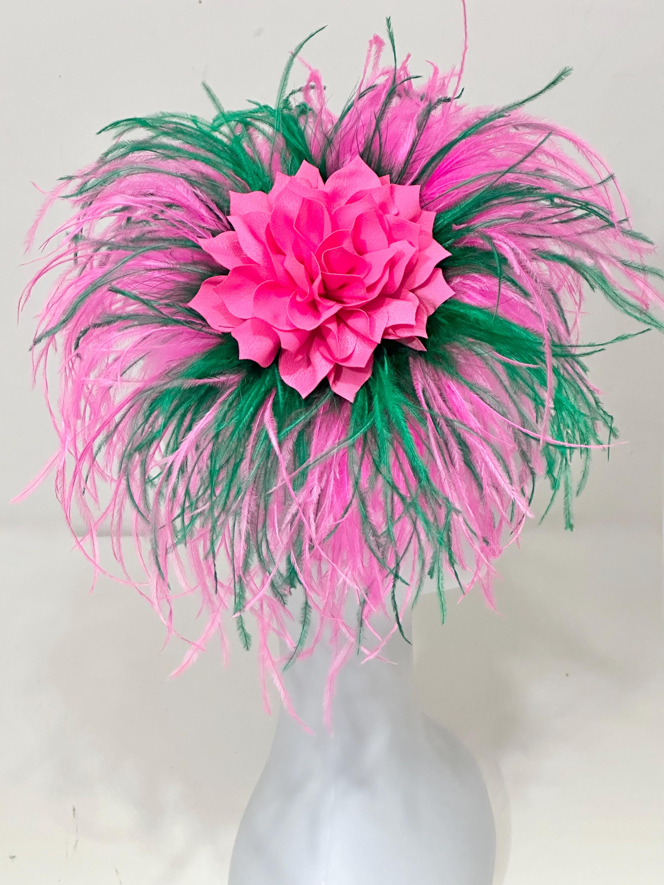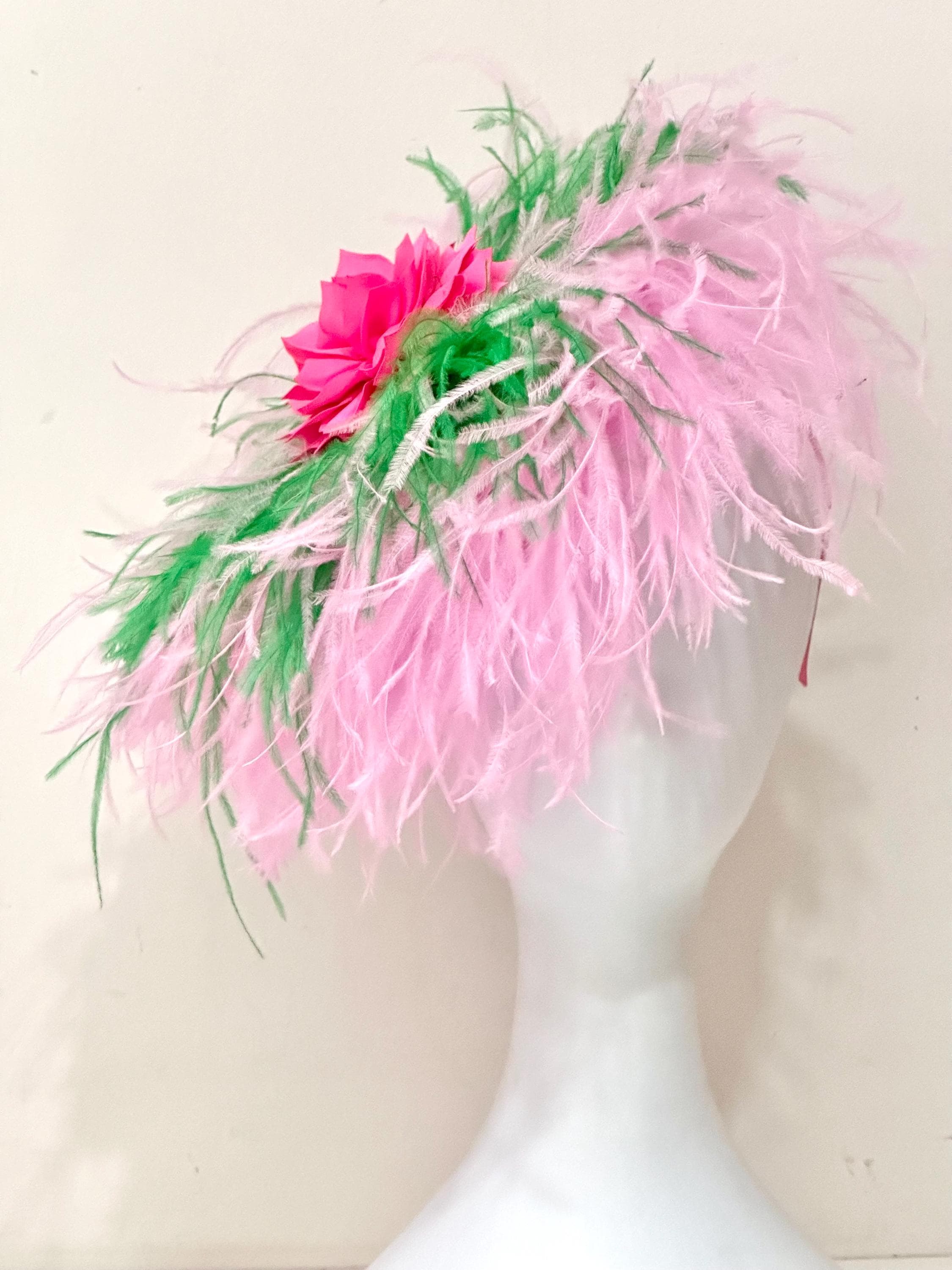 Pink Feather Fascinator Hat, Bright Pink Green Ostrich Feather Fascinator Hat, Kentucky Derby Fascinator Hat Garden Tea Party Hat Bespoke