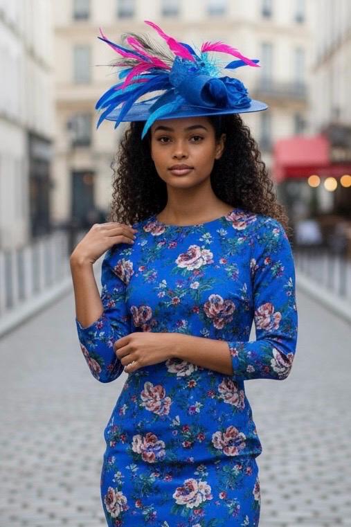 Big Brim Fascinator Hat with Royal Blue Roses, with an array of Black Hot Pink, Royal Blue, Peacock Feathers, Ostrich Feather