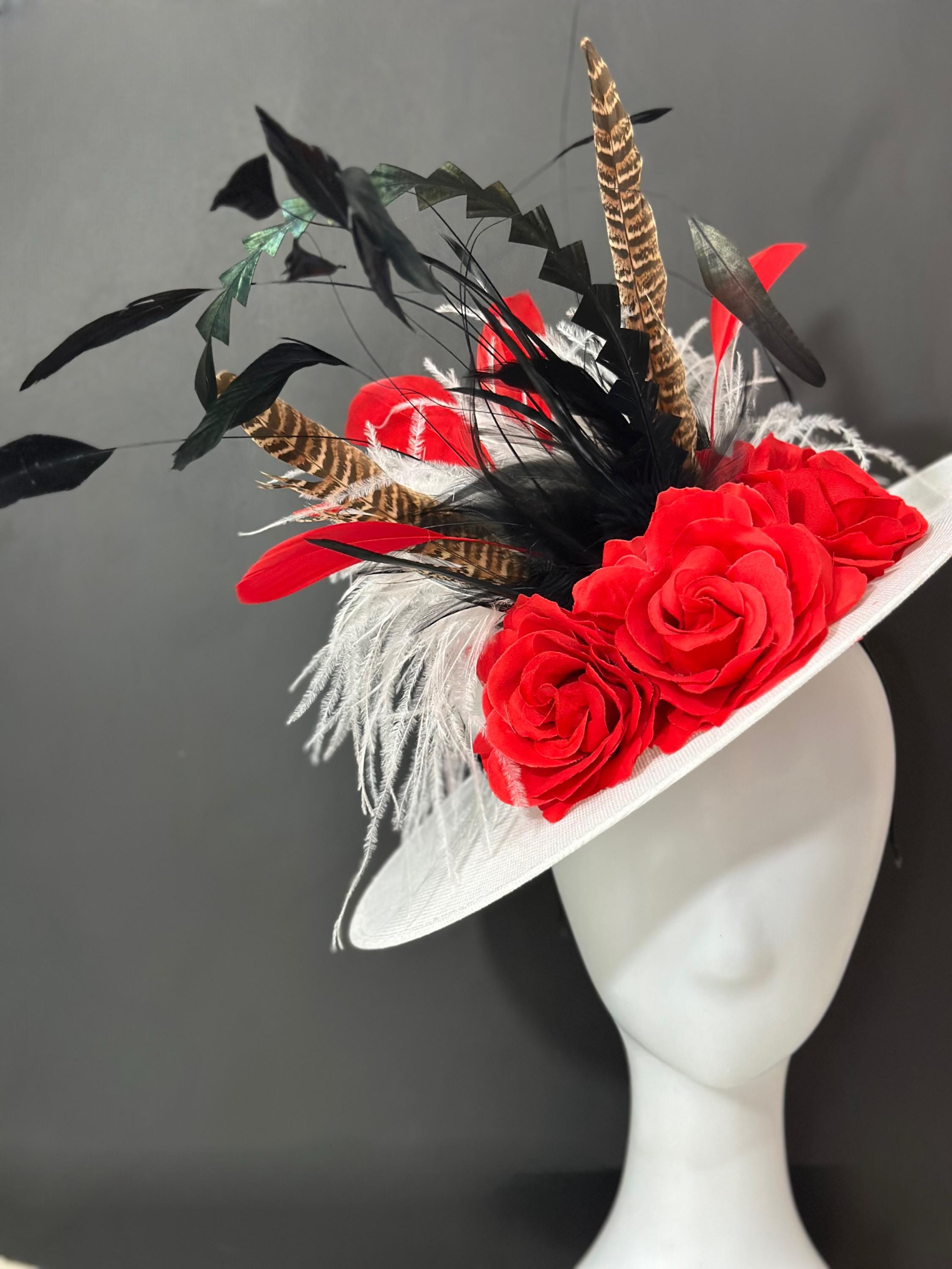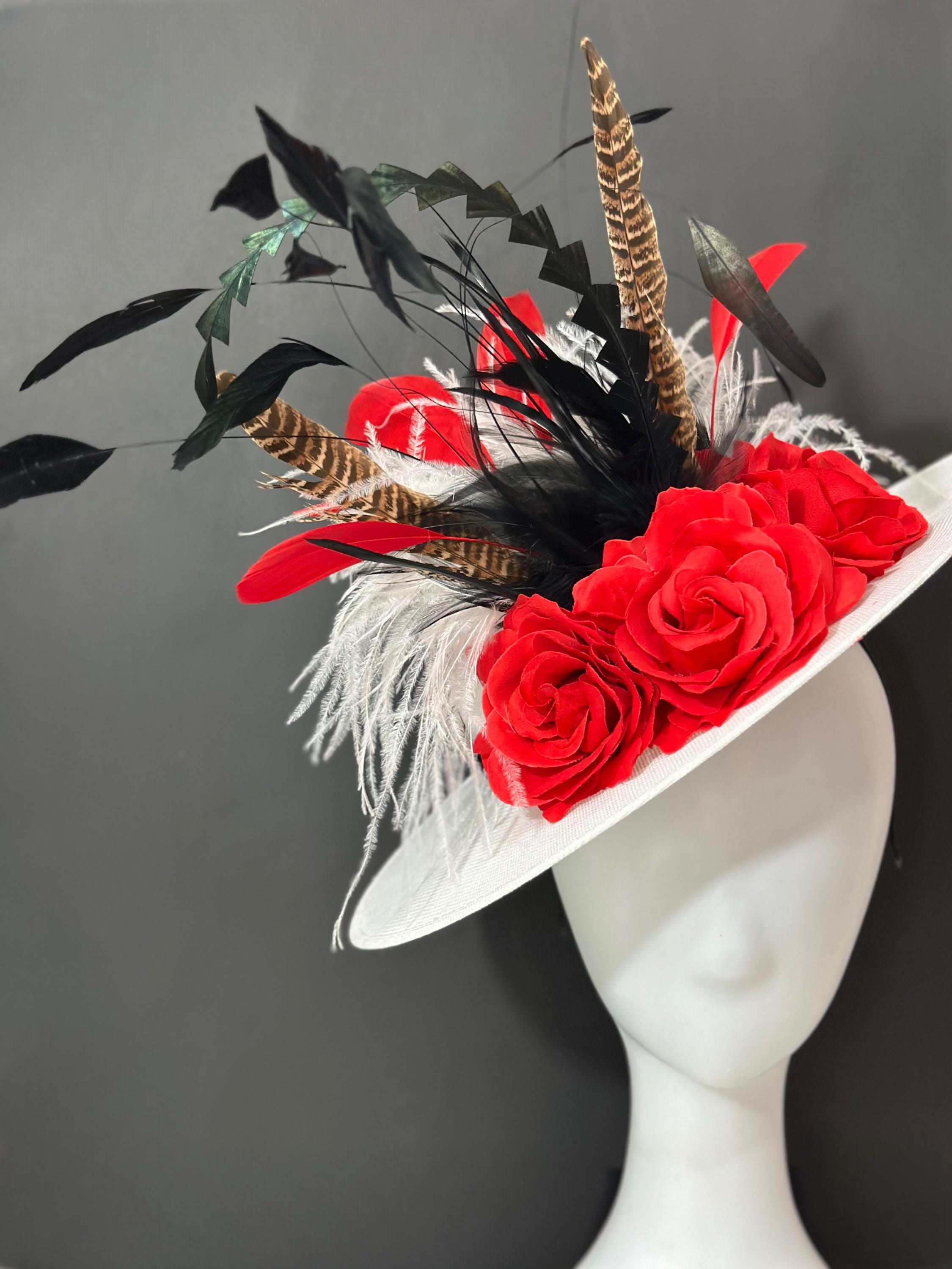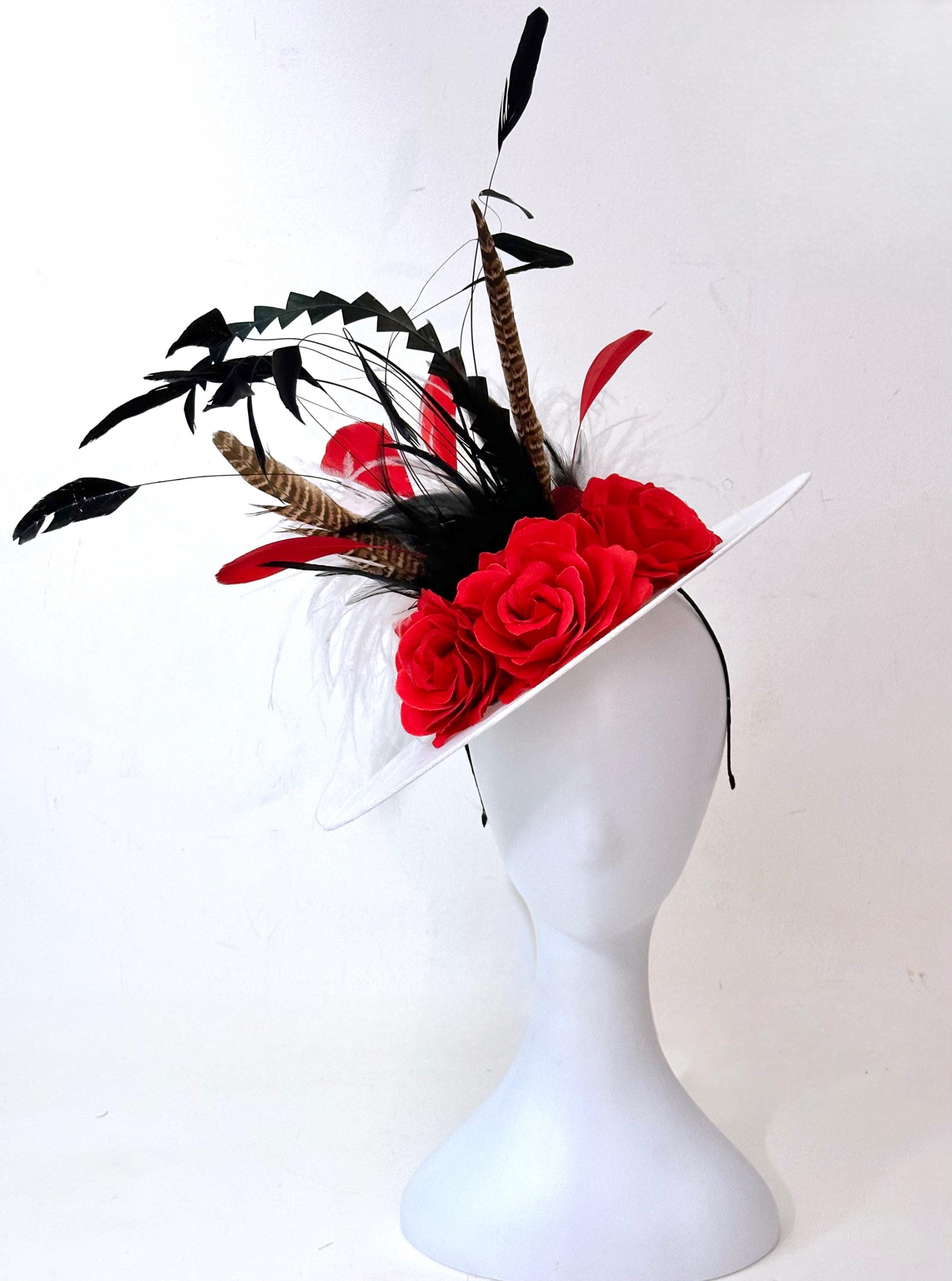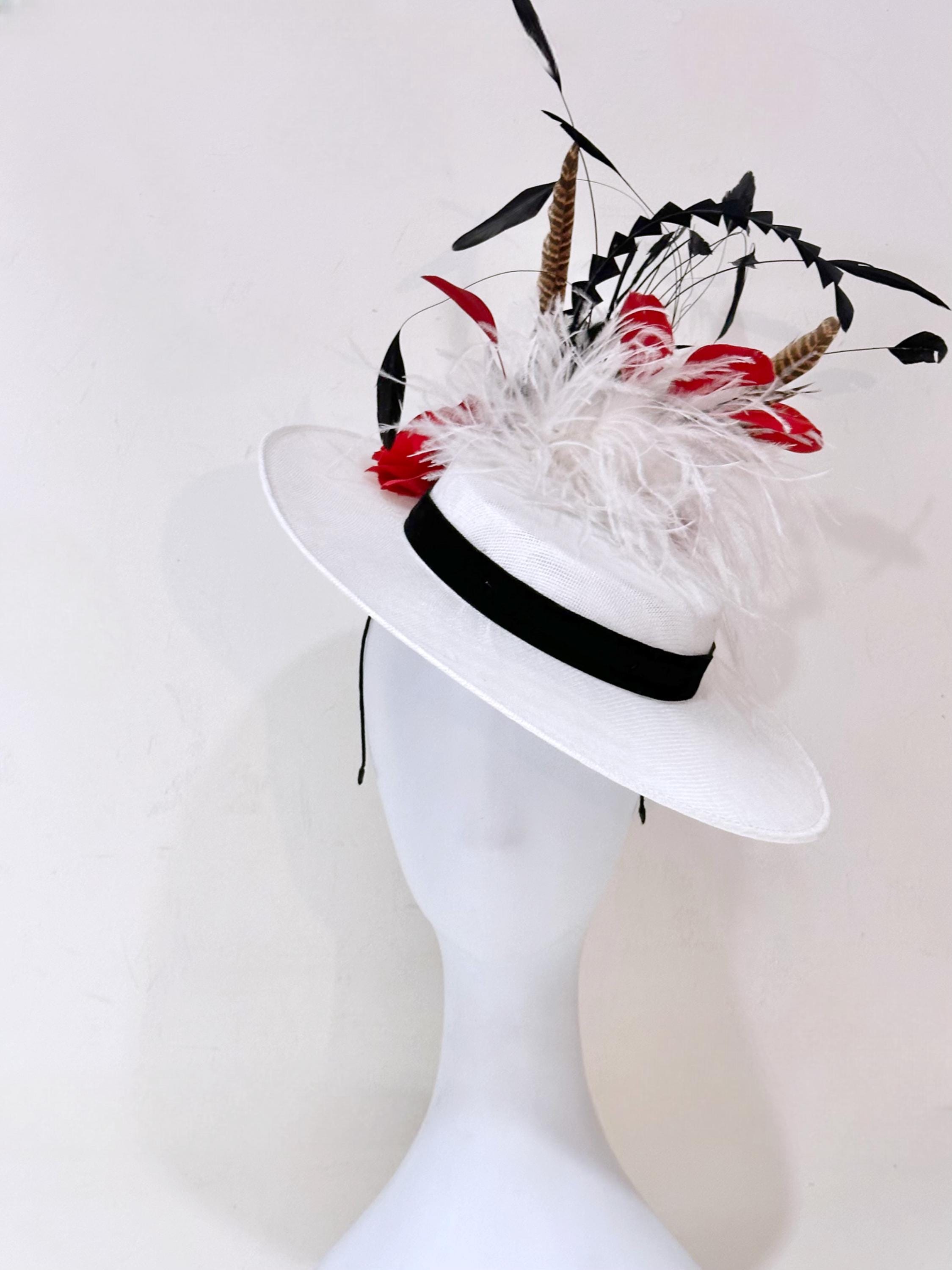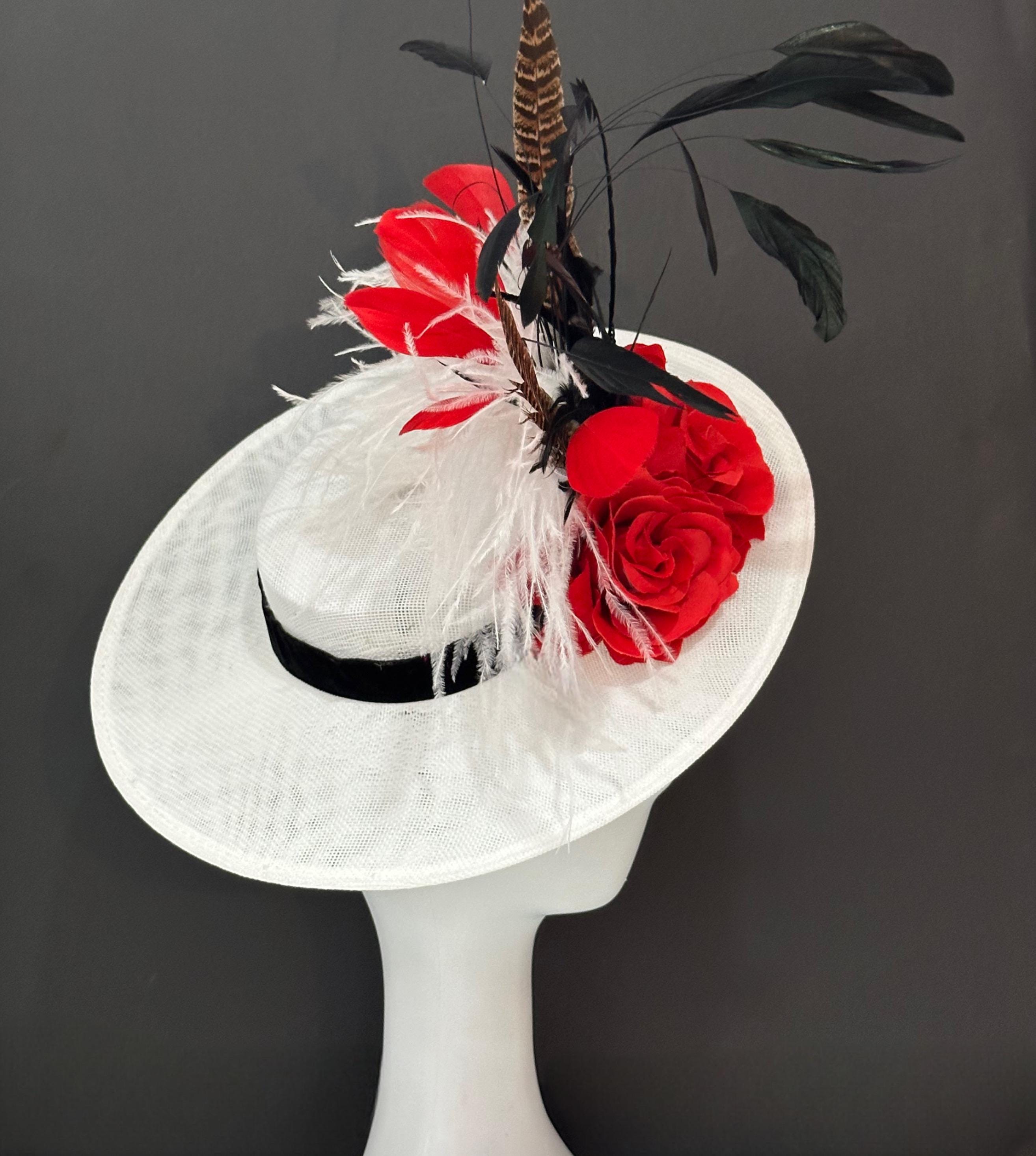 Red Black White Derby Fascinator Hat, White Boater Hat with Red Roses, Black White FeatherOne of Kind!!!