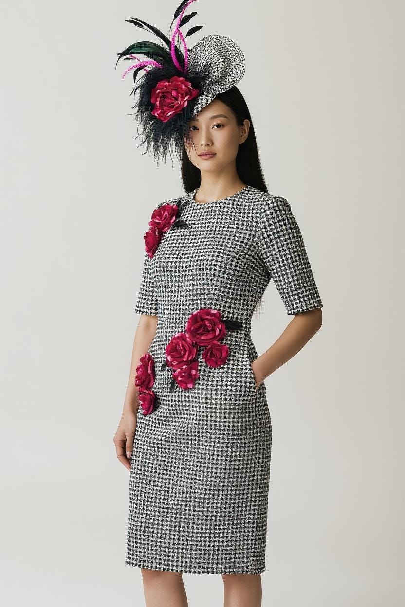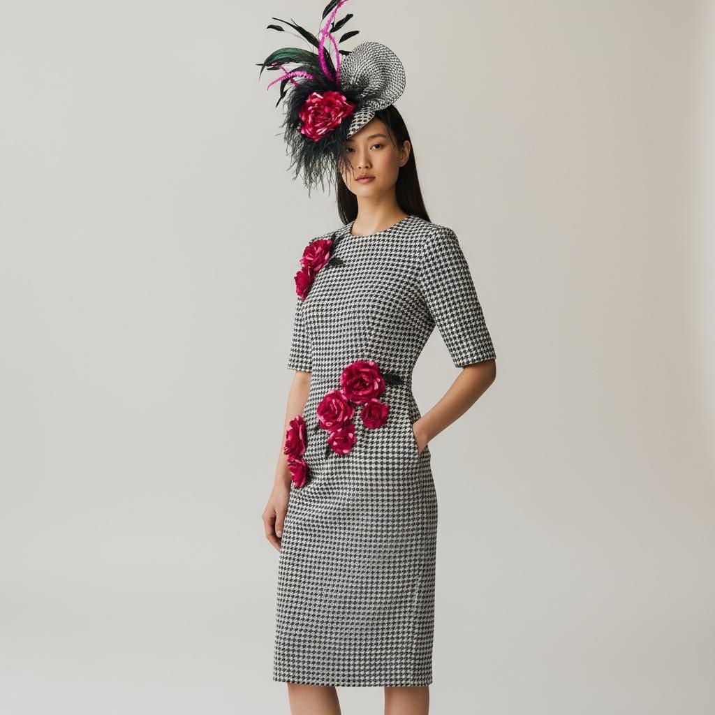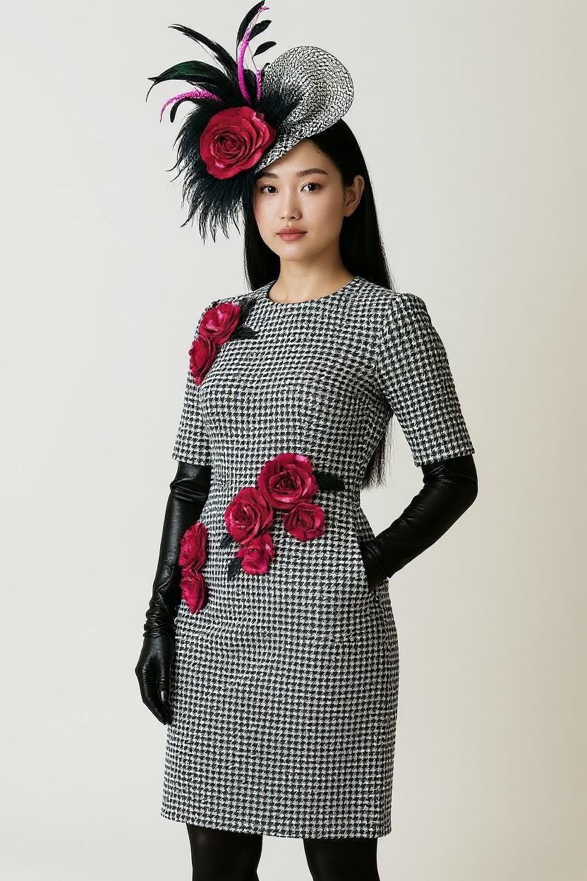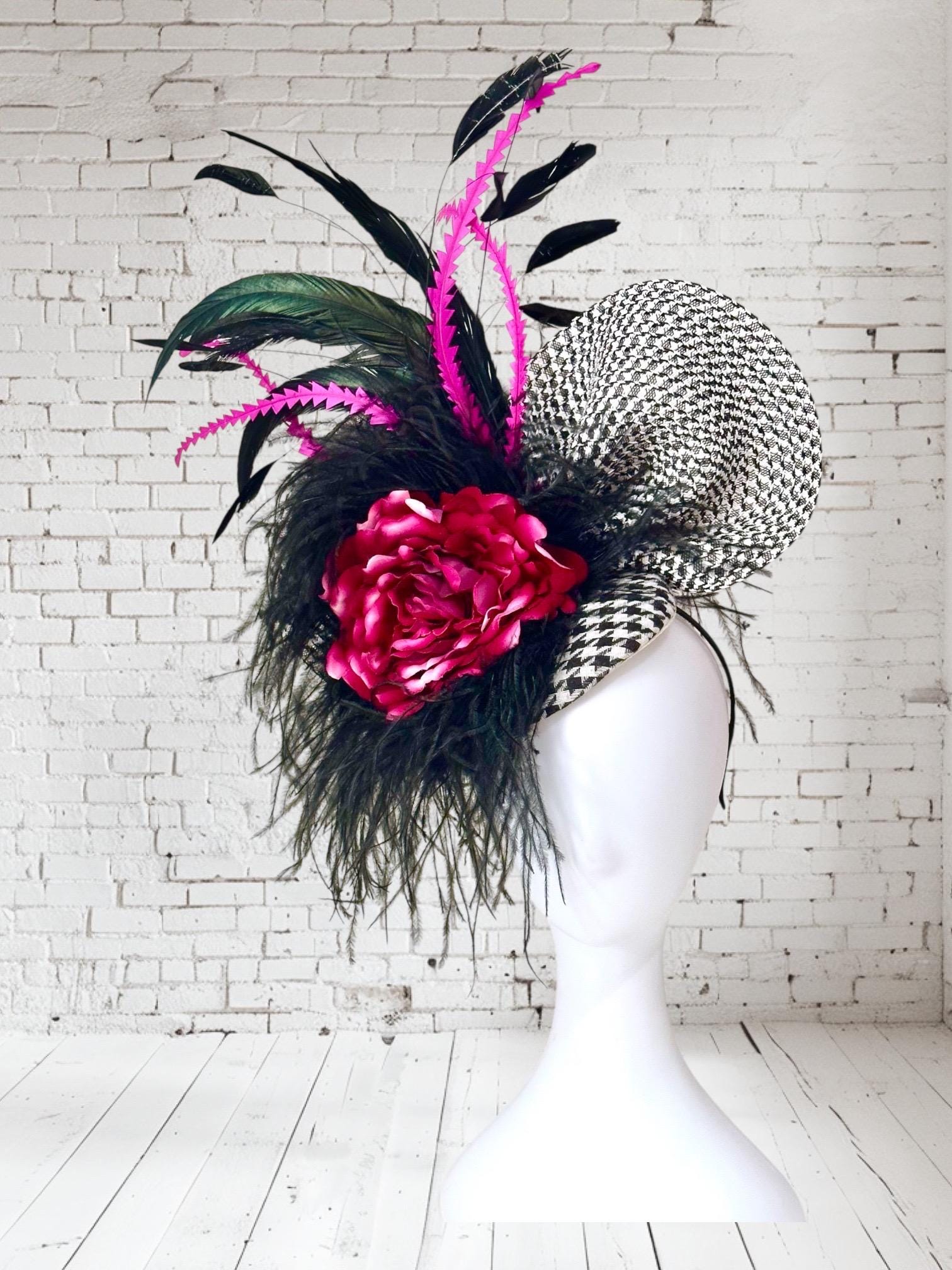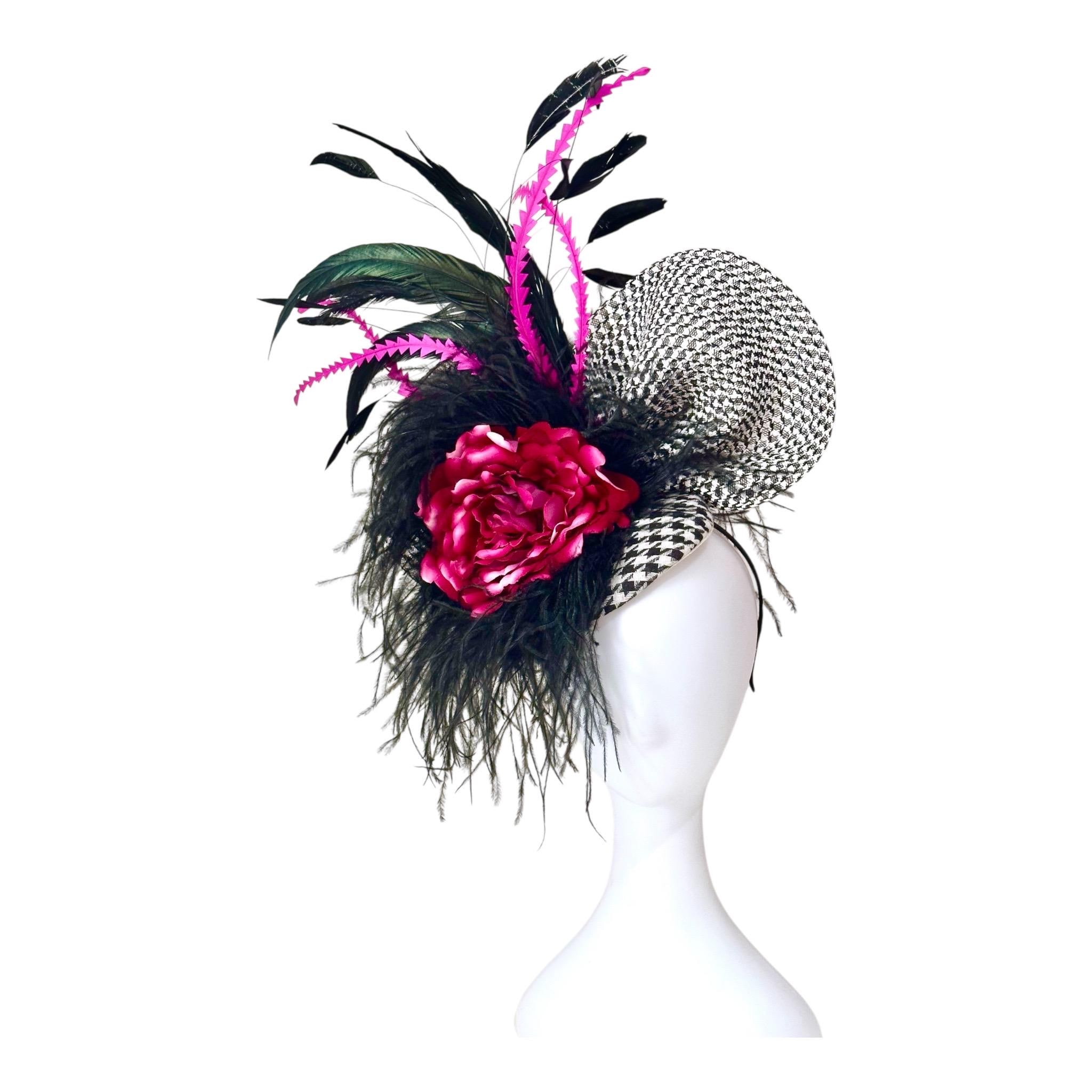 Black White Pink Fascinator Hat, One of a Kind! 3D Fascinator, Look Fabulous at every angle! Herringbone Tween Hat adorned with a bouquet of Black, Fuchsia Pink Feathers with a Large Deep Fuchsia Rose.It's Gorgeous!!