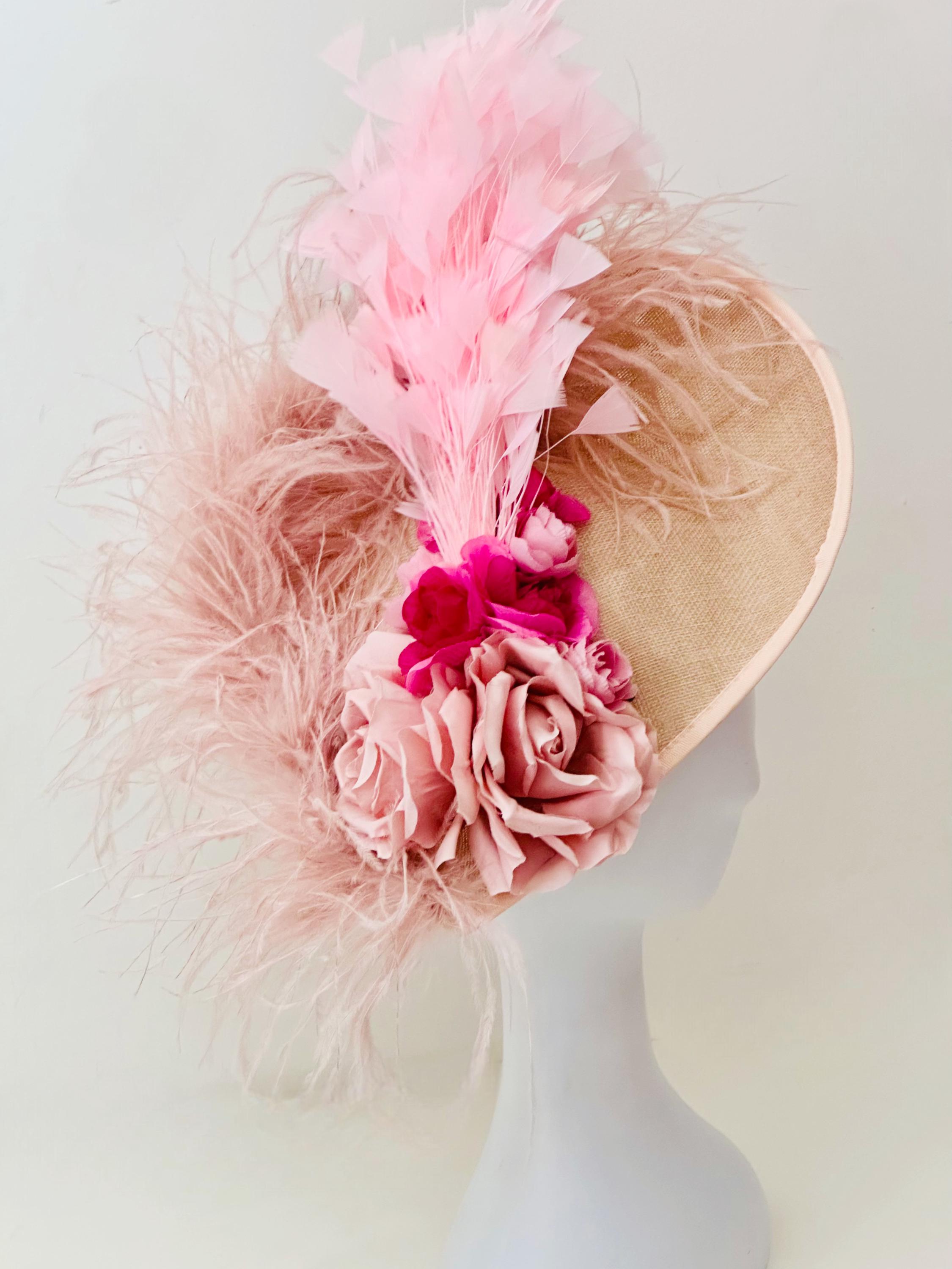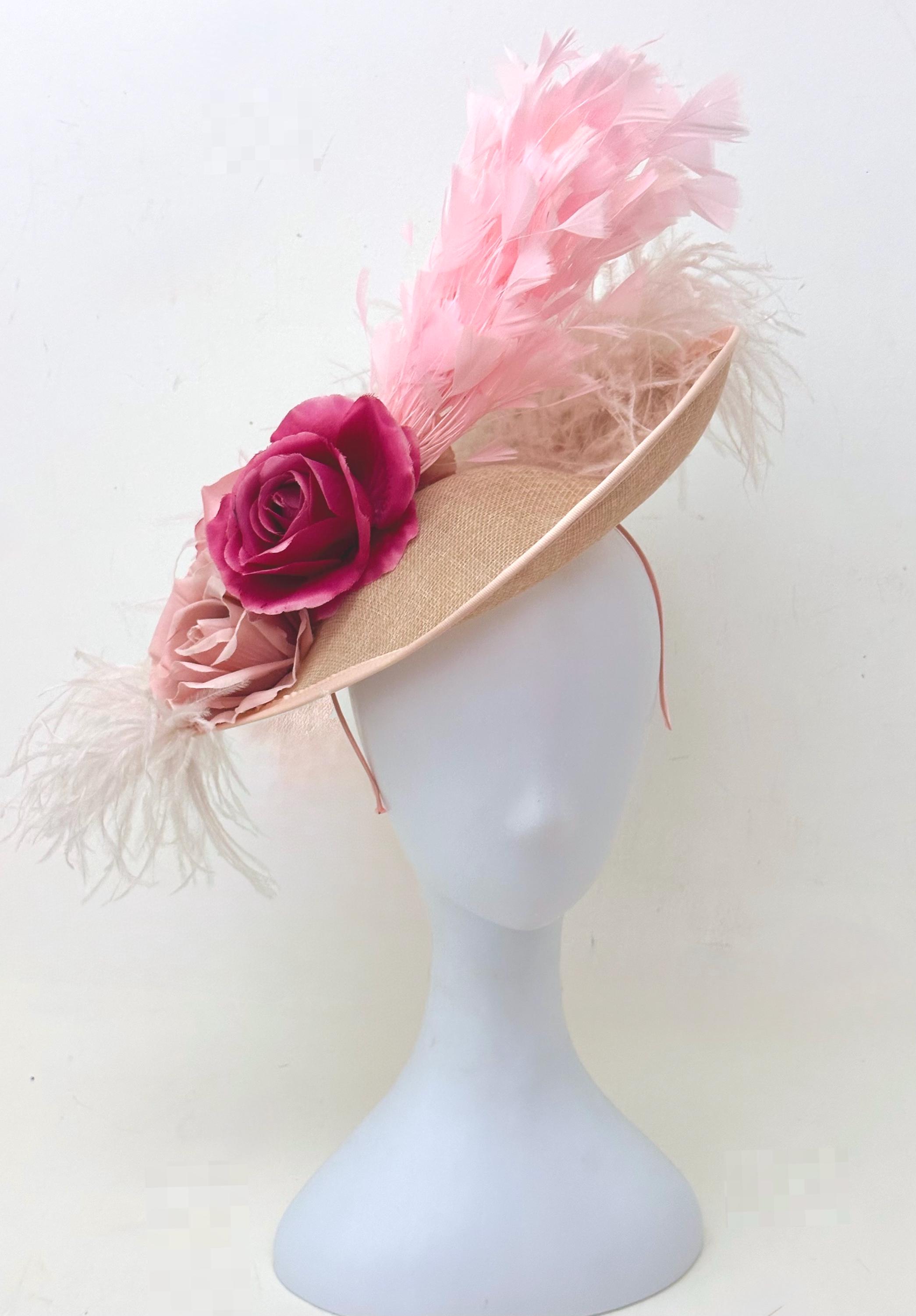 Beautiful 3D Double sided Derby Fascinator Hat, Dusty Blush Pink Roses, Rose Pink, with Pink Coque Feathers, with Your Choice...... 8 ply Ostrich Feather Champagne Beige Feather ( hint of pink) or