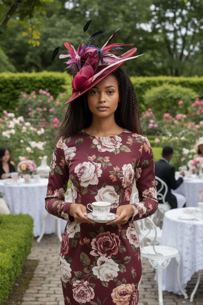 Burgundy Wine Fascinator Hat, Big Deep Red Wine with a bouquet of Feathers, Dusty Rose Pink, Black, Plum Feather Fascinator hat, on a 23 inch textured fascinator hat,It's a Beauty!!
