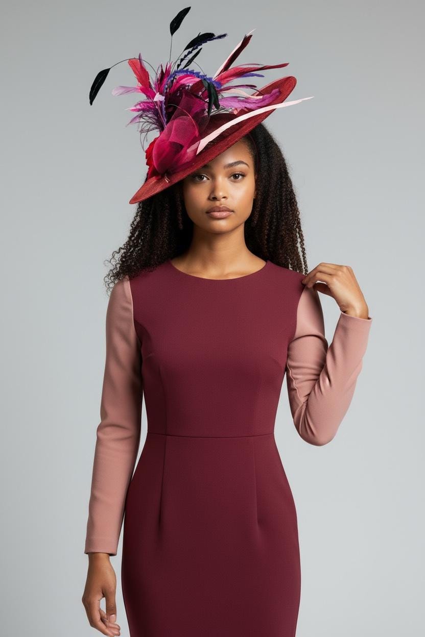 Big Brim 23cm Texture Hat with Burgundy Roses, with amazing mix of Marabou Ostrich and Coque Feathers in