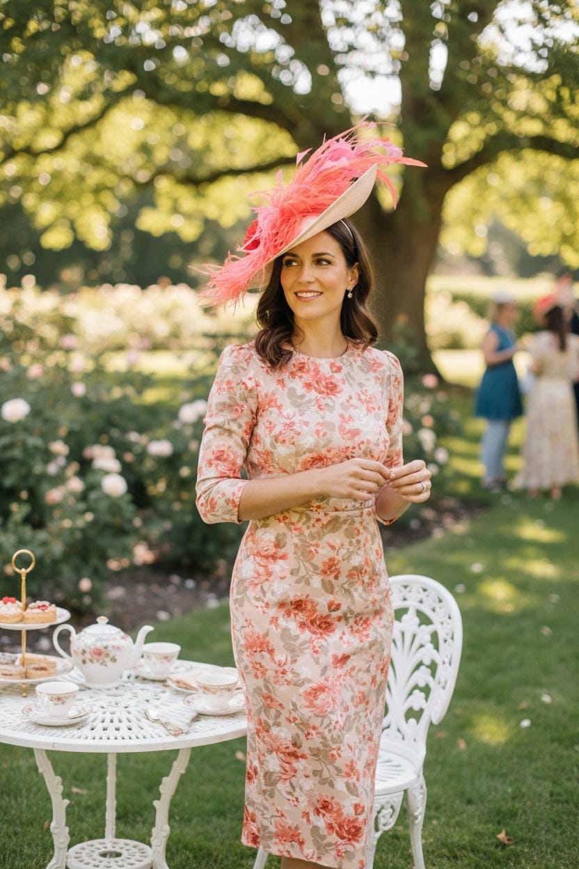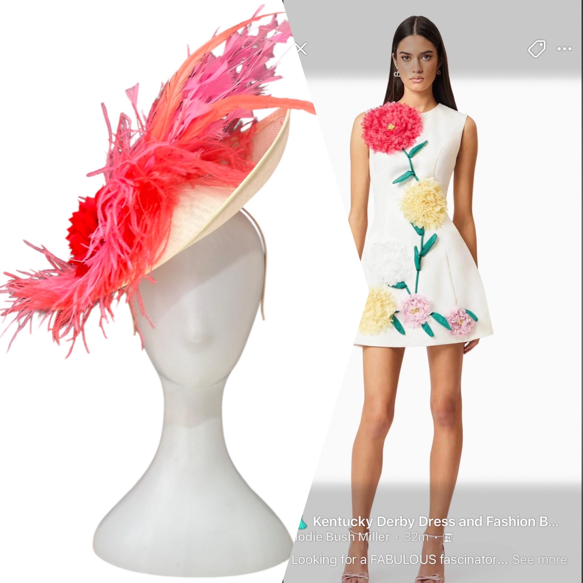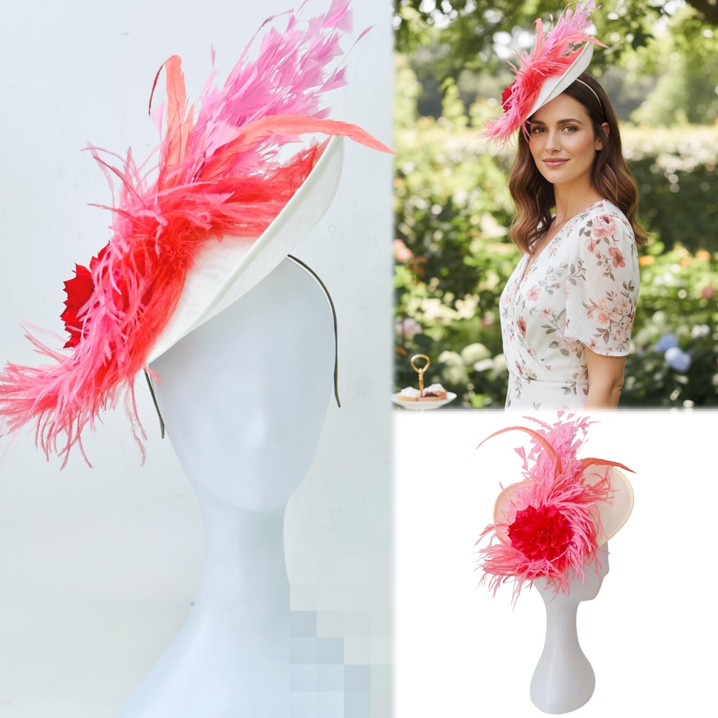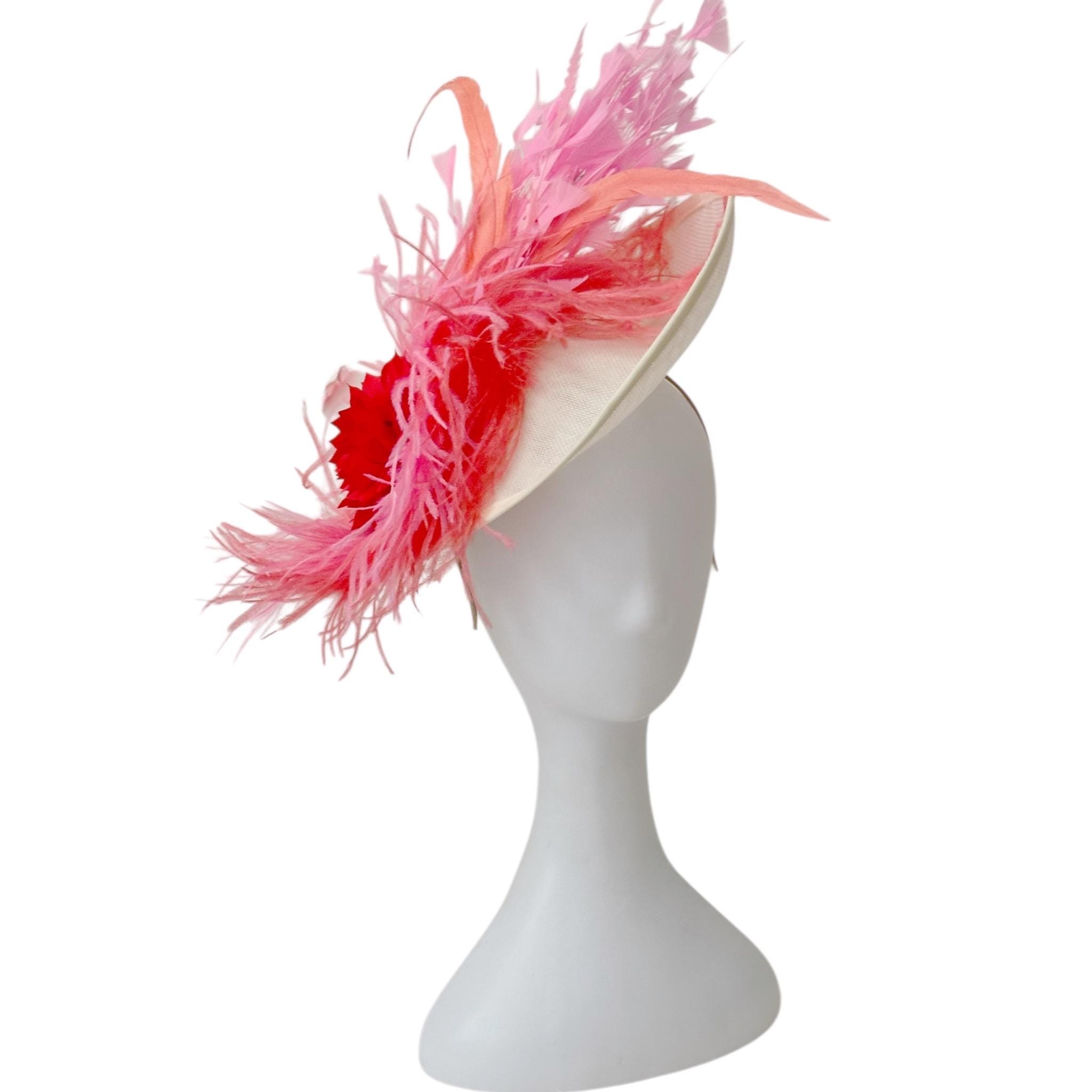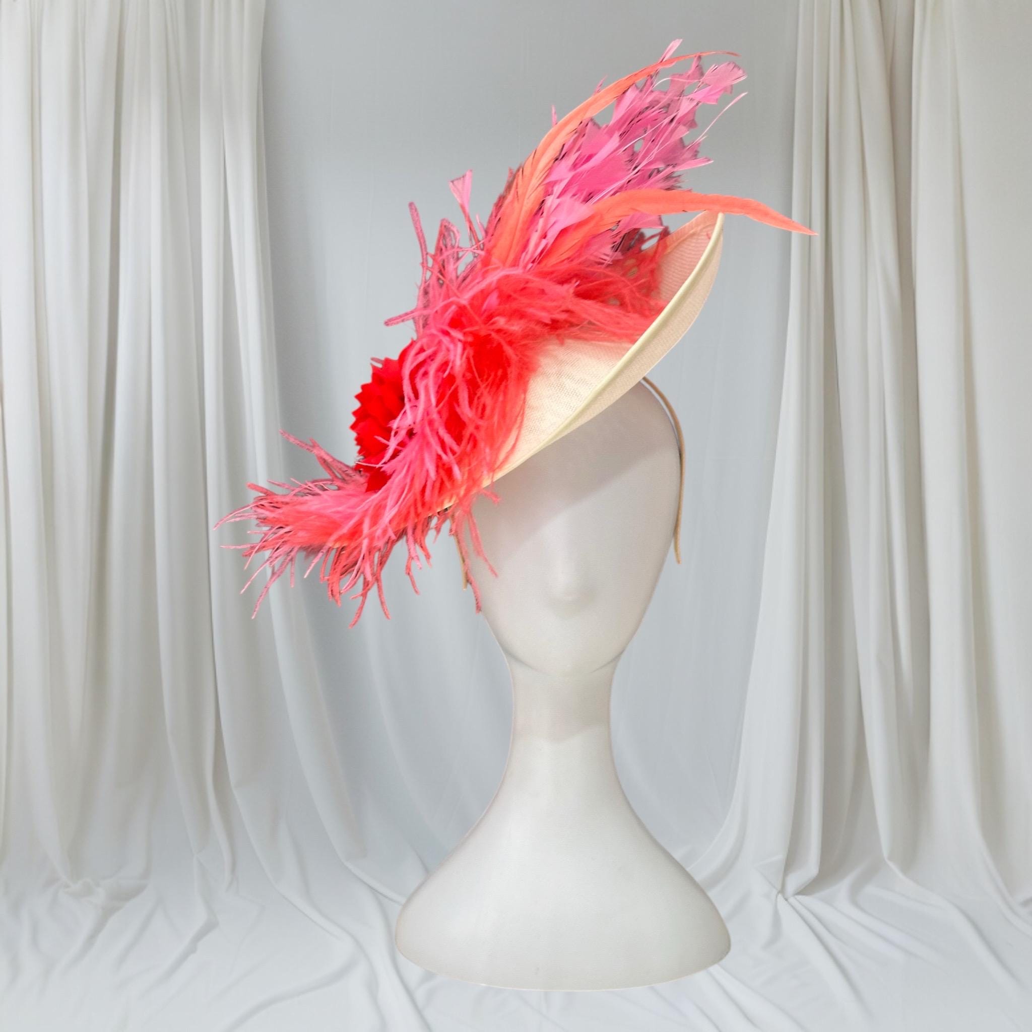 Shades of Corals / Coral Pink/ Pink Ostrich Feathers (4ply) Marabou feather, Light Pink Turkey Feathers, Coral Rooster Feather with Poppy Coral Flower on a 12" Heart shapes style Light Beige Sinamay Hat Base.