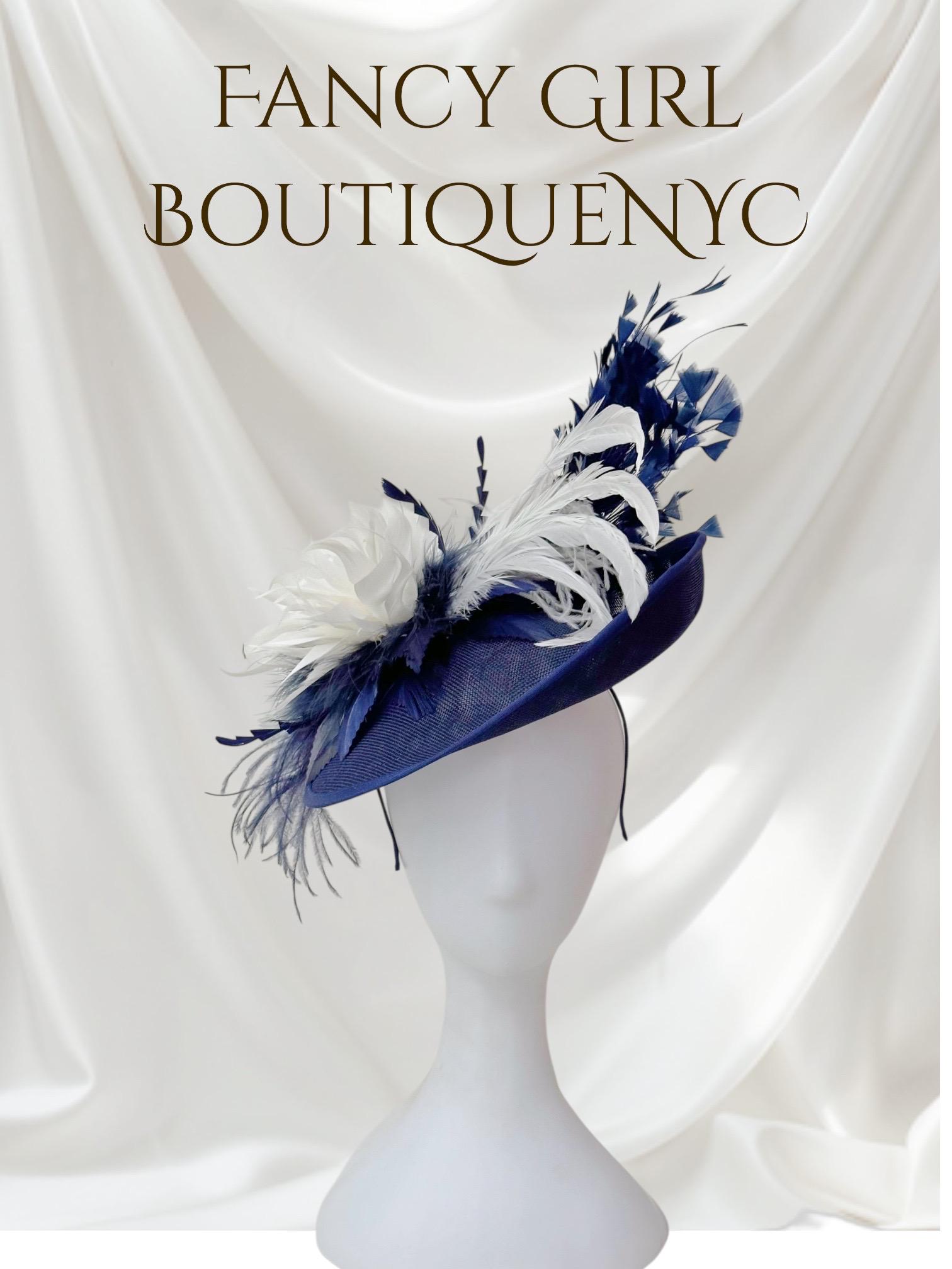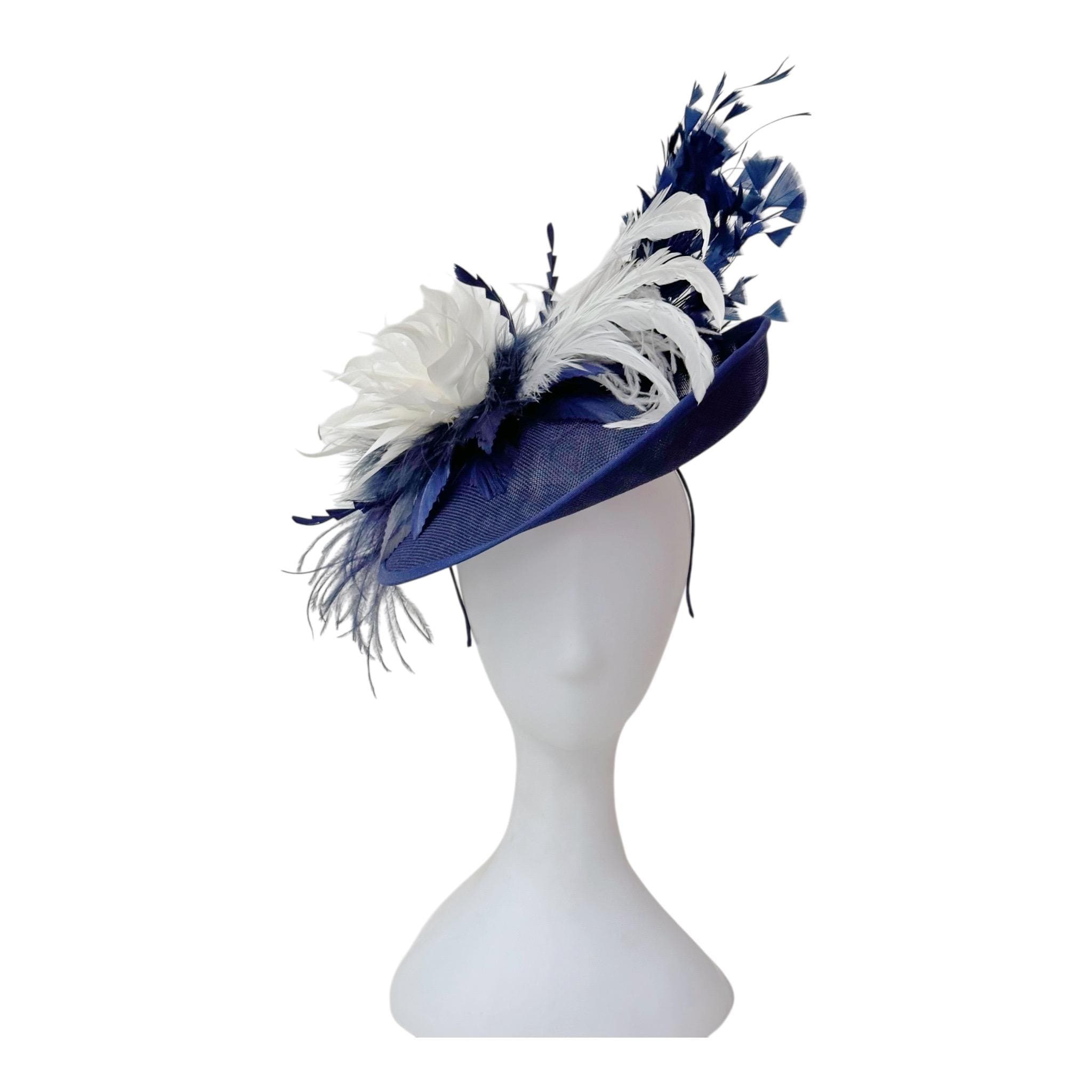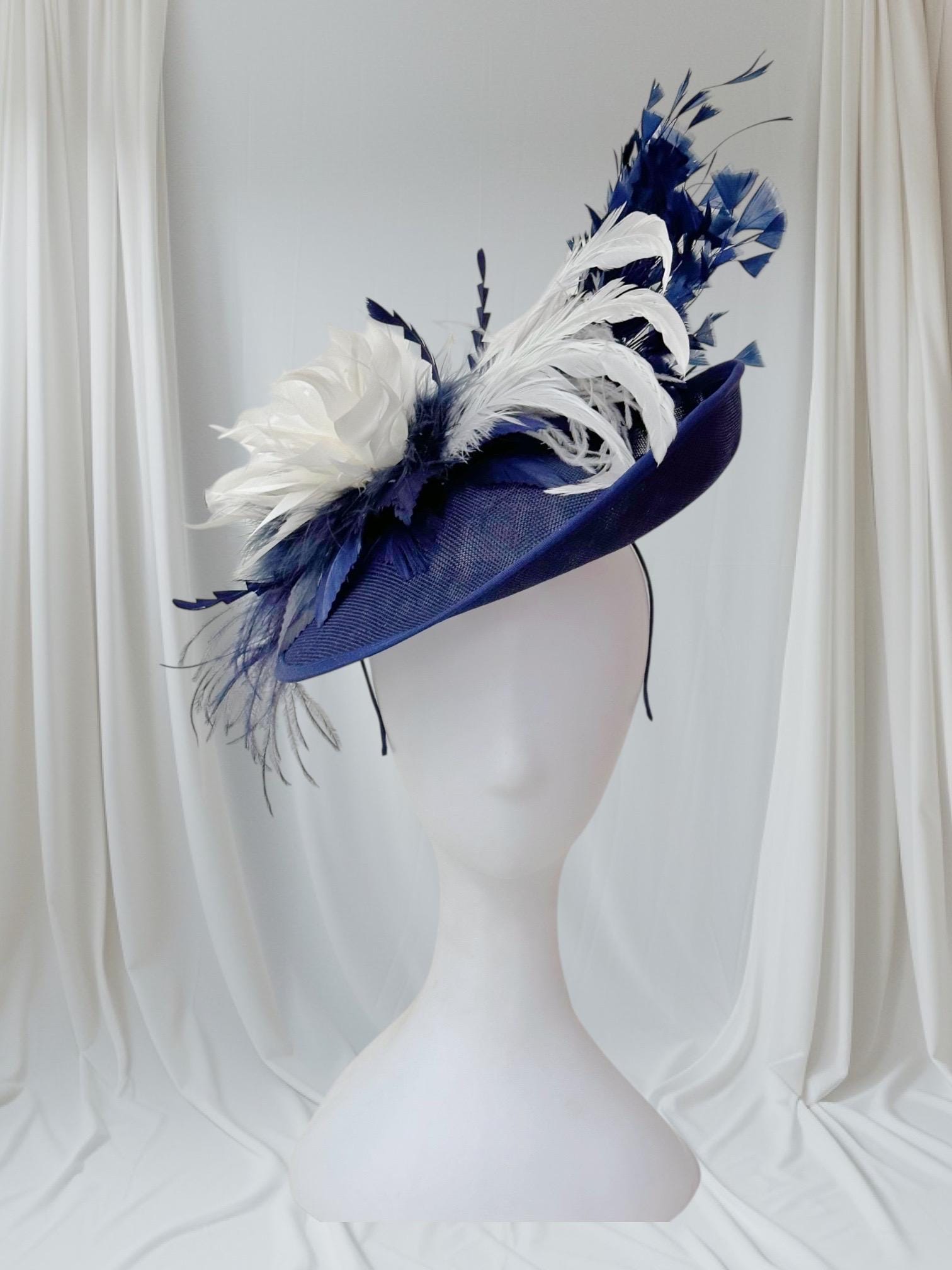 Navy White Feather Flower Fascinator Hat, 3D Fascinator, Perfect for Wedding, Mother of the Bride, Derby FascinatorNavy and White Feather on a 12" Round Textured Brim Hat on a Headband