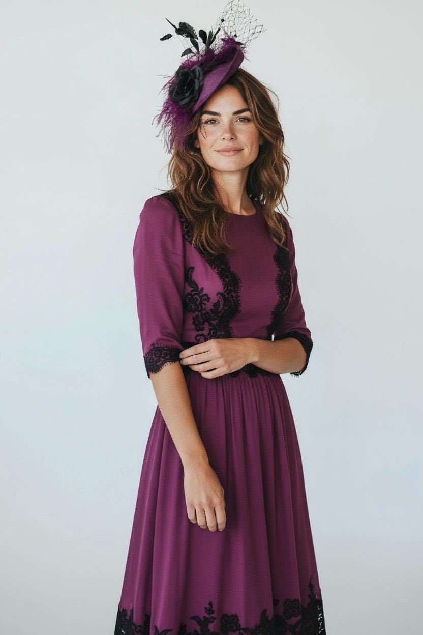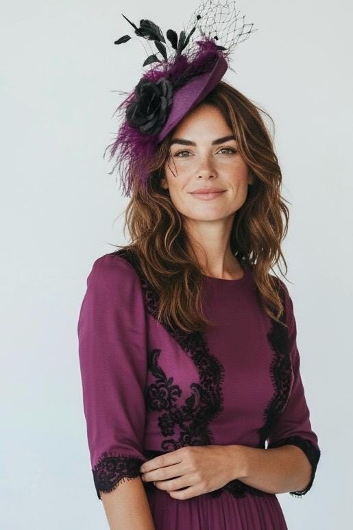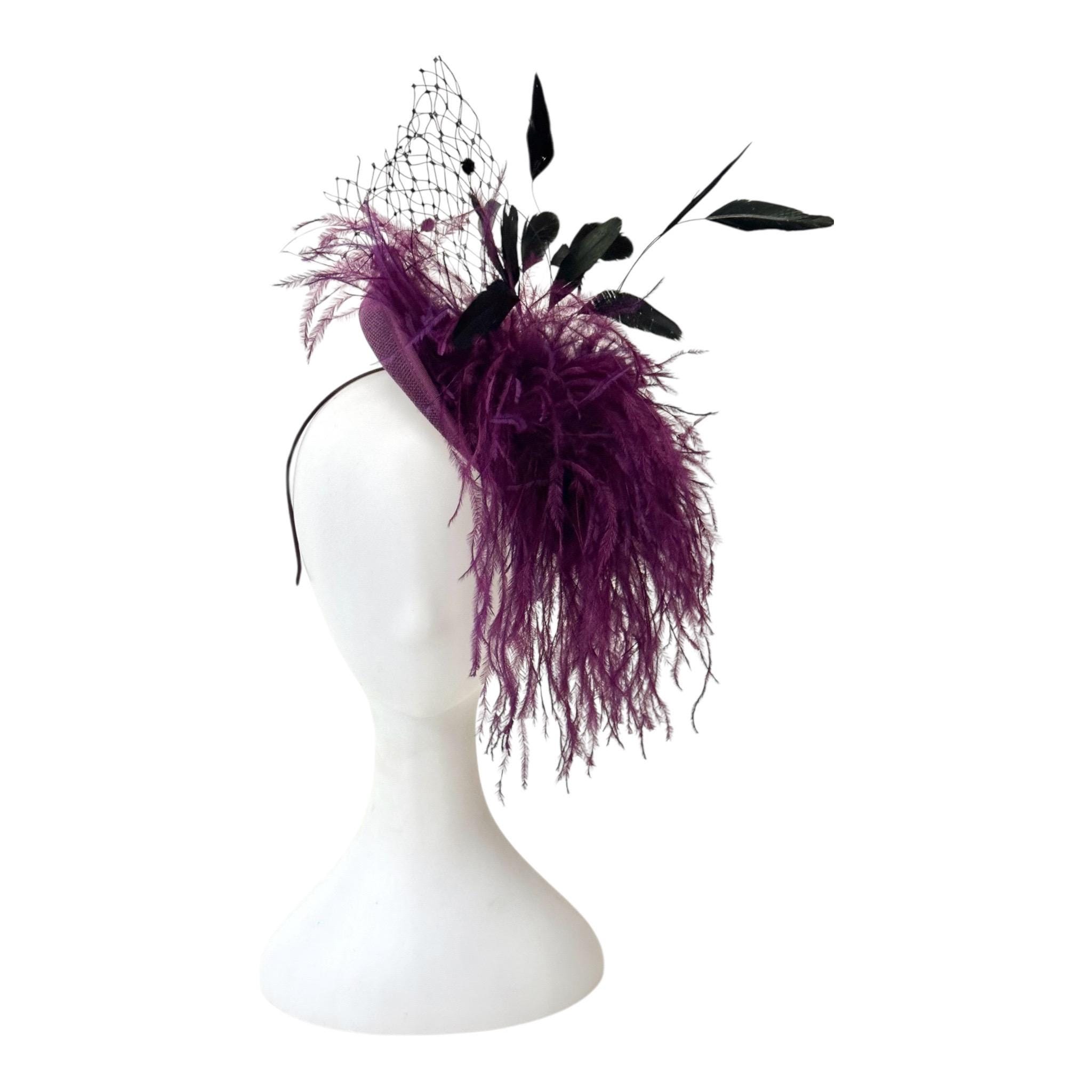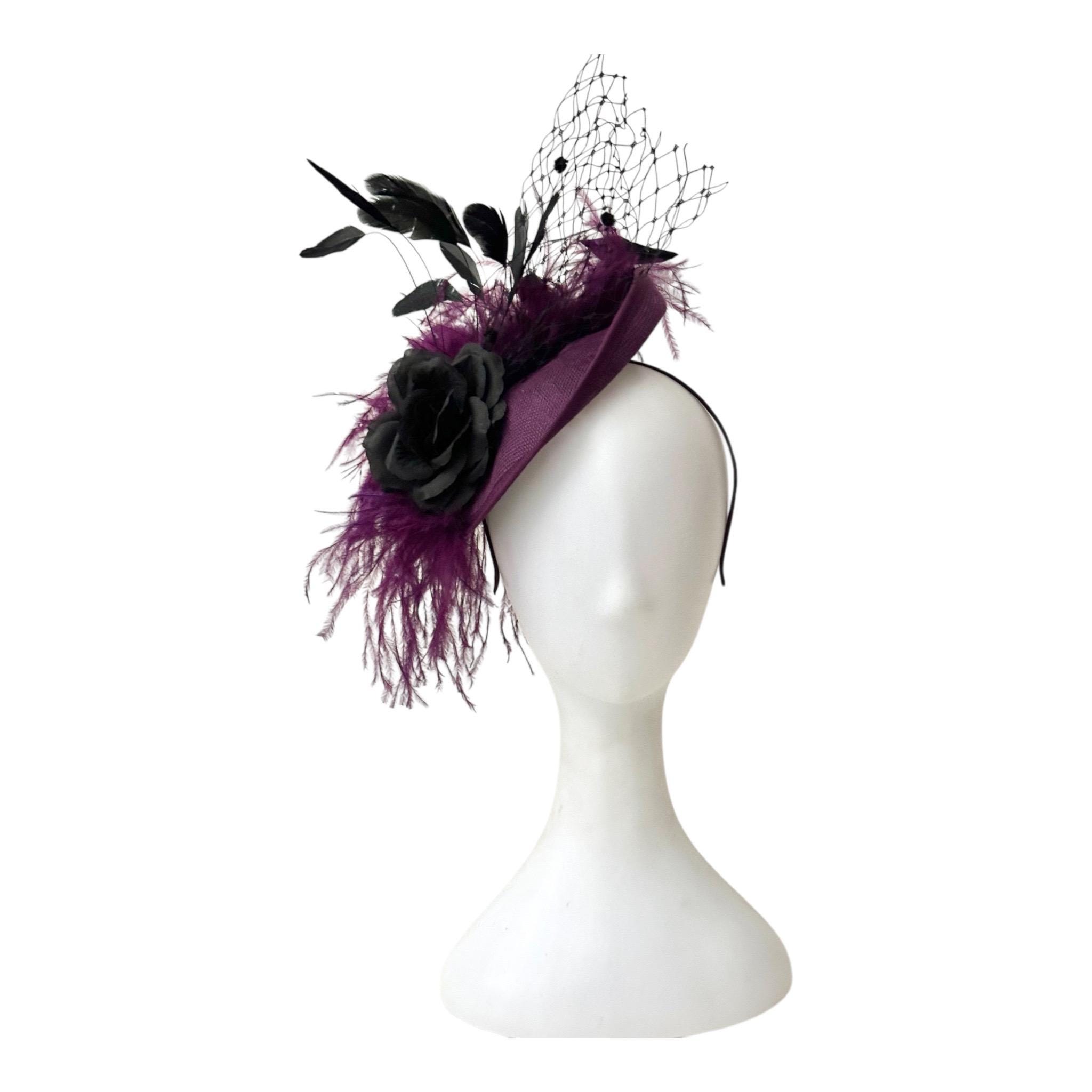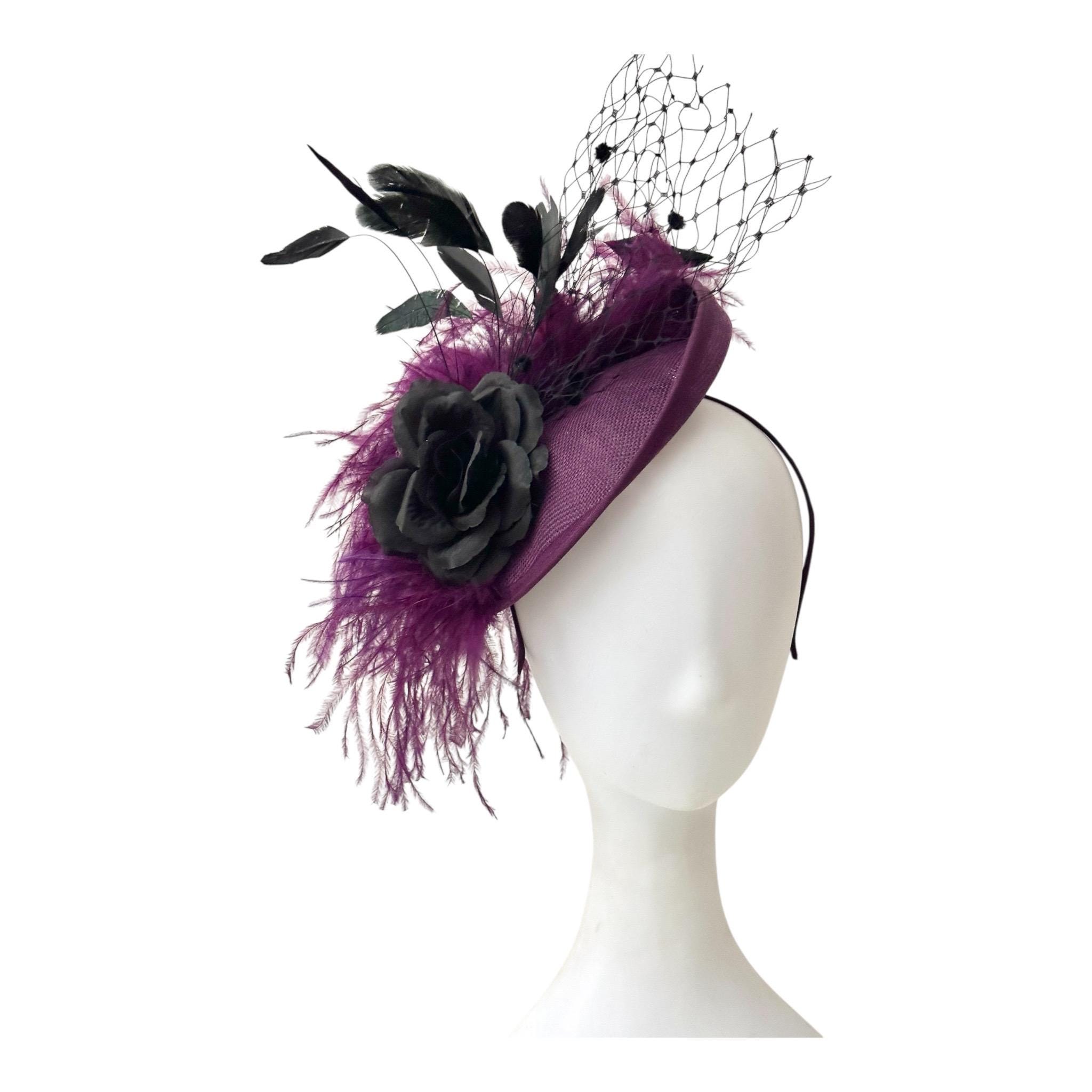 Custom Plum Black Rose Fascinator Hat, Plum Ostrich Feather Veil Fascinator Hat20in Sinemay Disk HatWith 6ply ostrich Feather