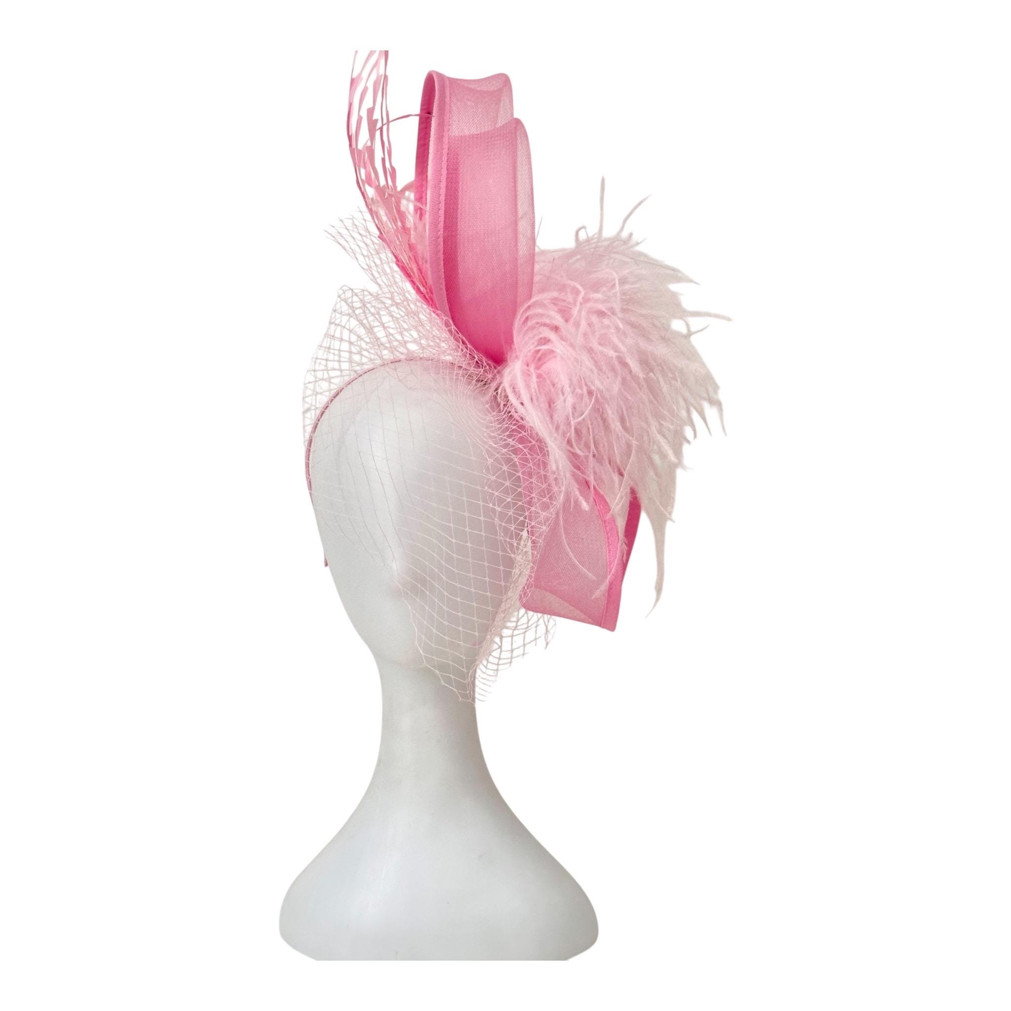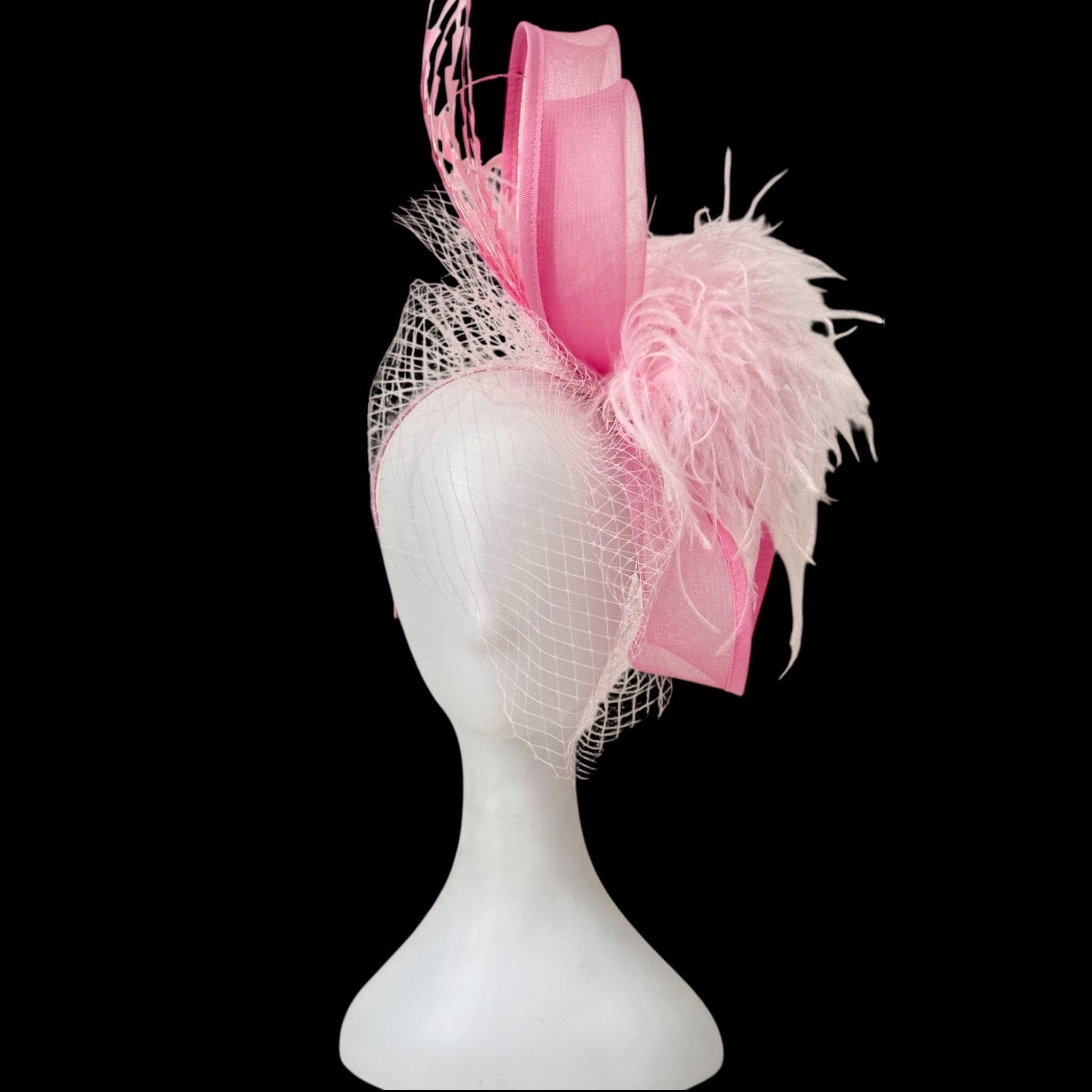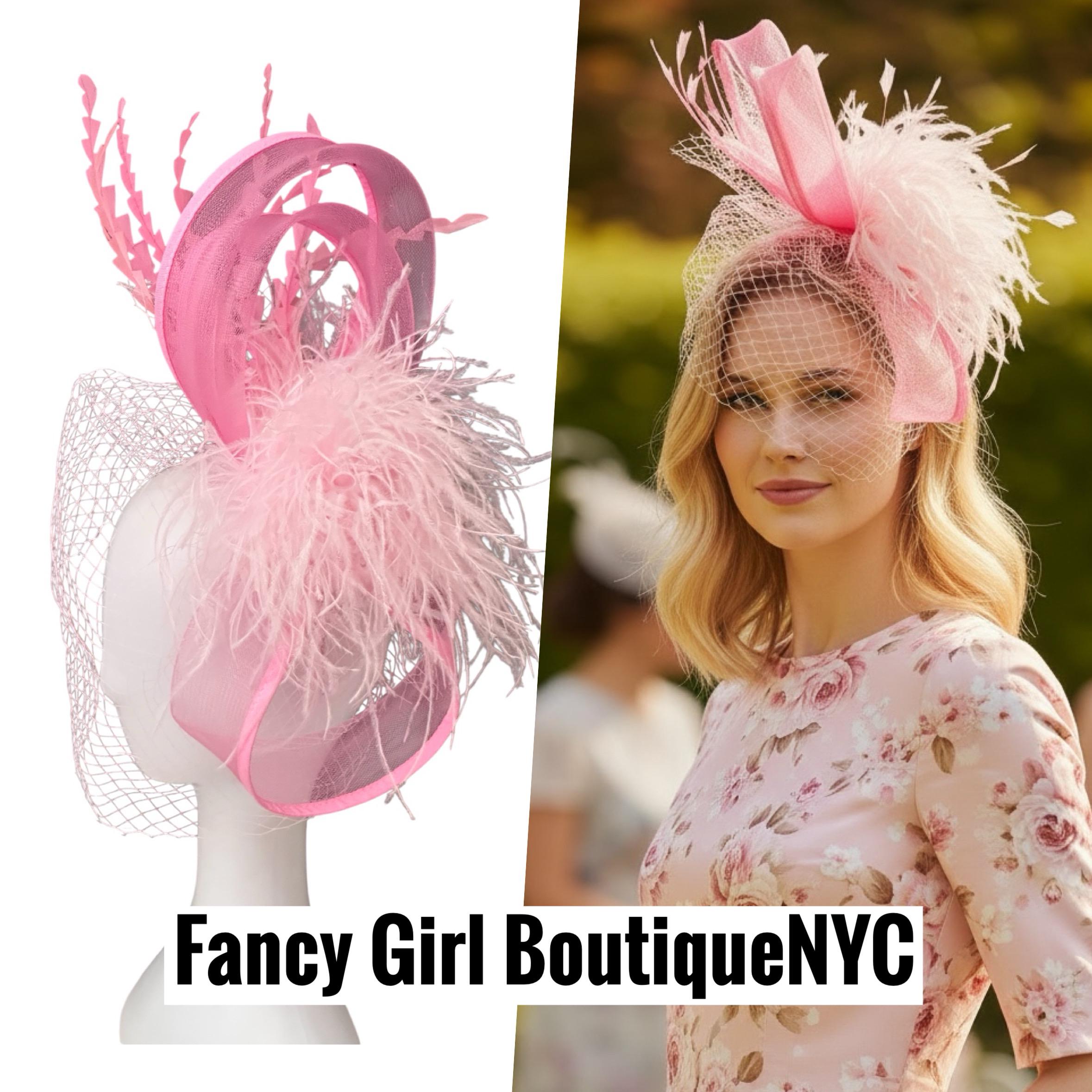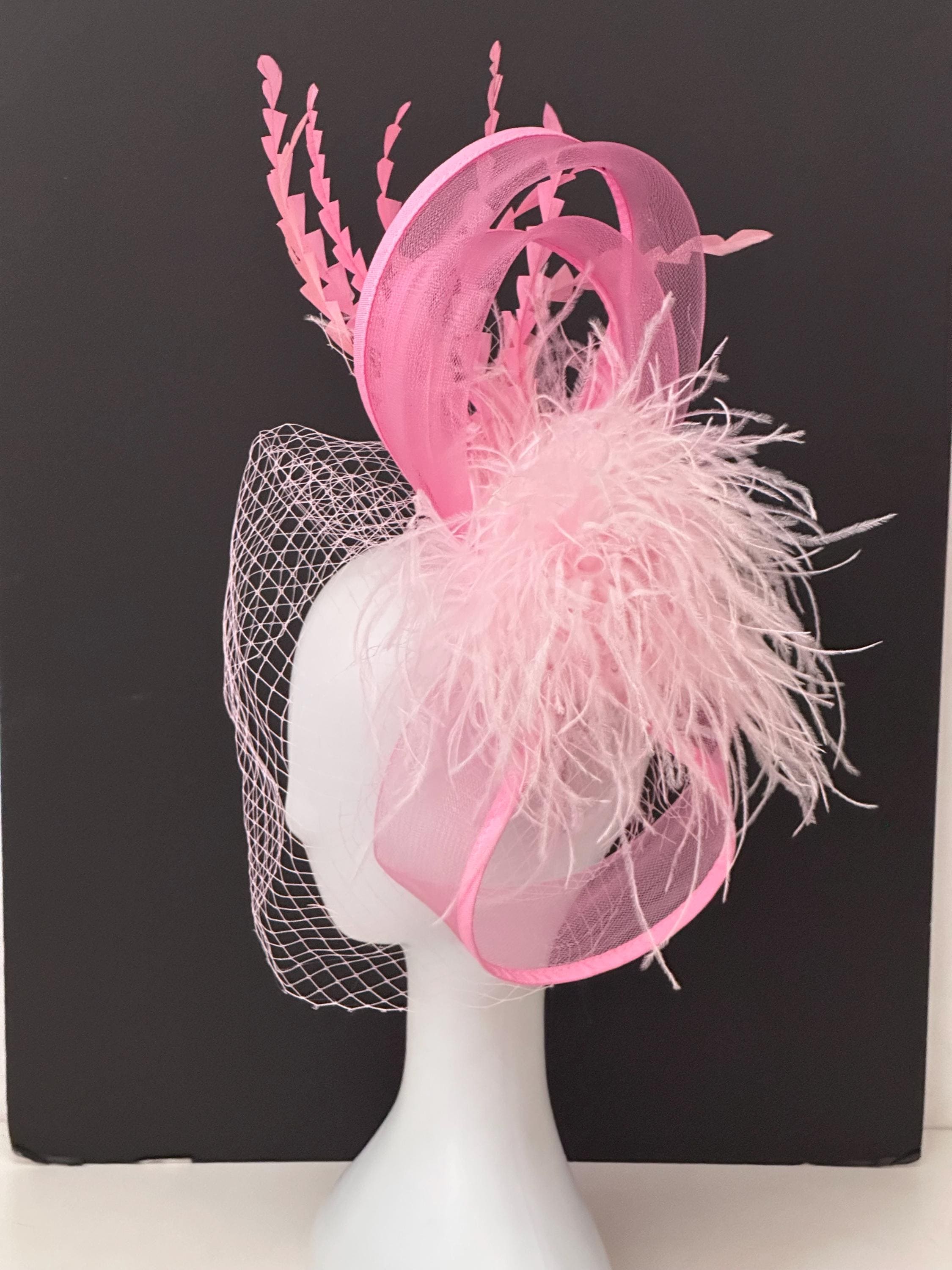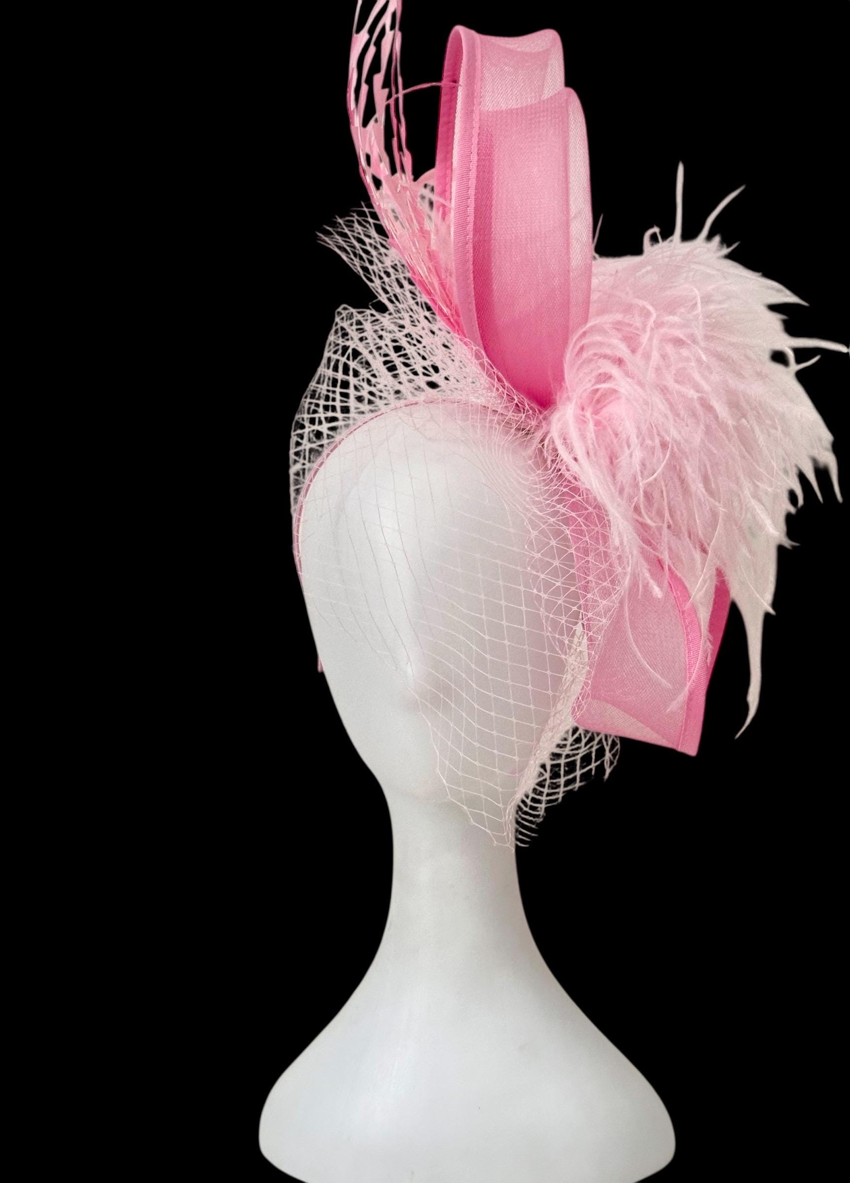 Kentucky Derby fascinator hat, Couture Pink Feather Fascinator Hat, Church Wedding Feather Pink Feather, Veil Fascinator Hat Sweet and sultry..6 ply ostrich feather