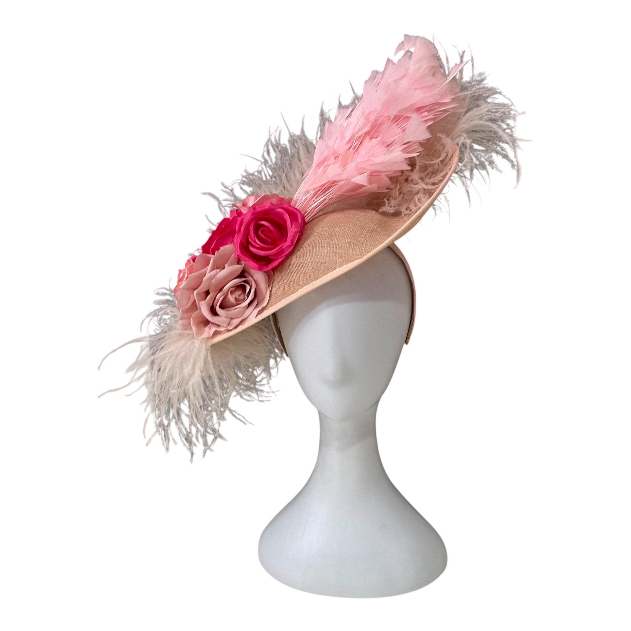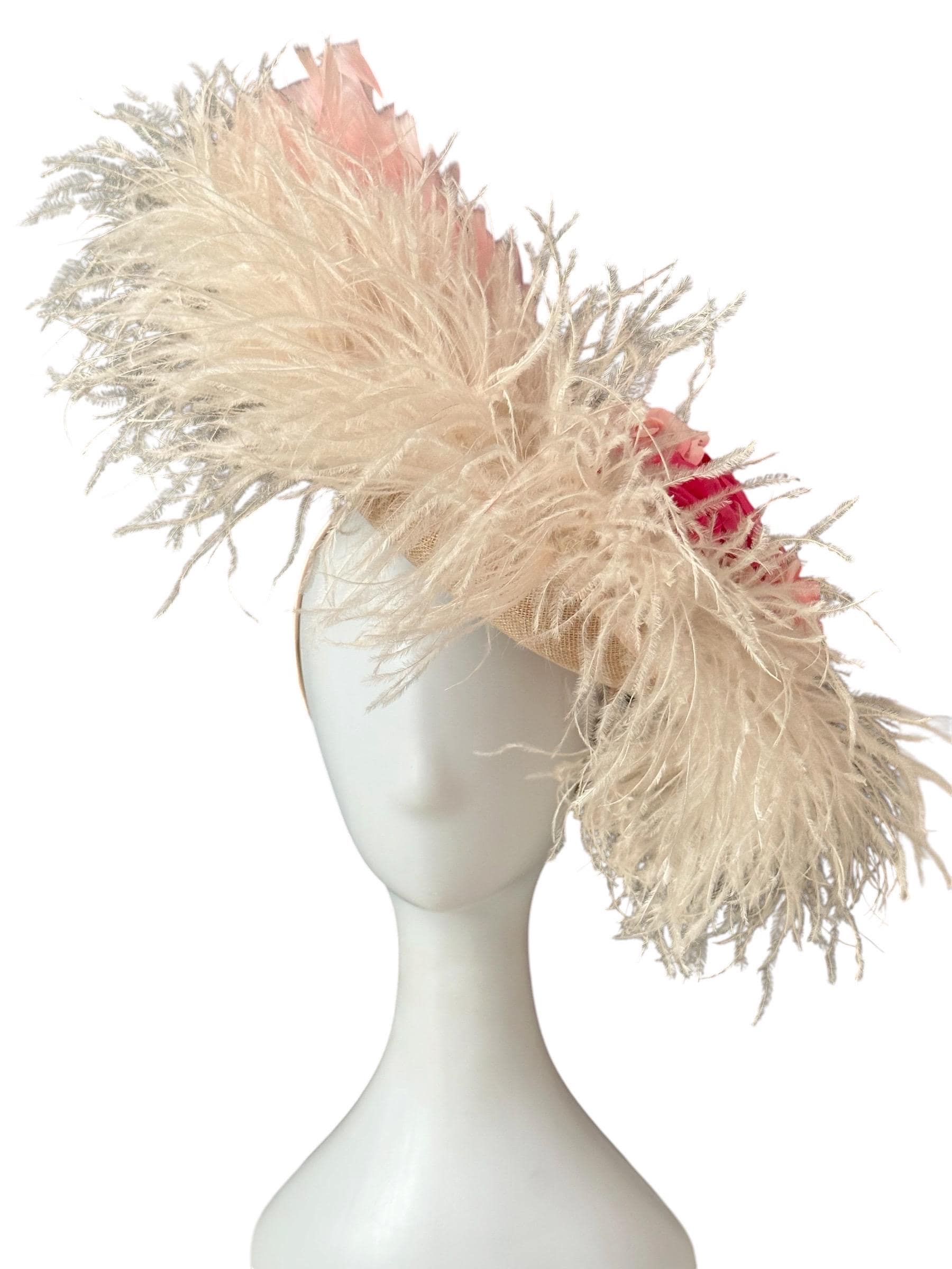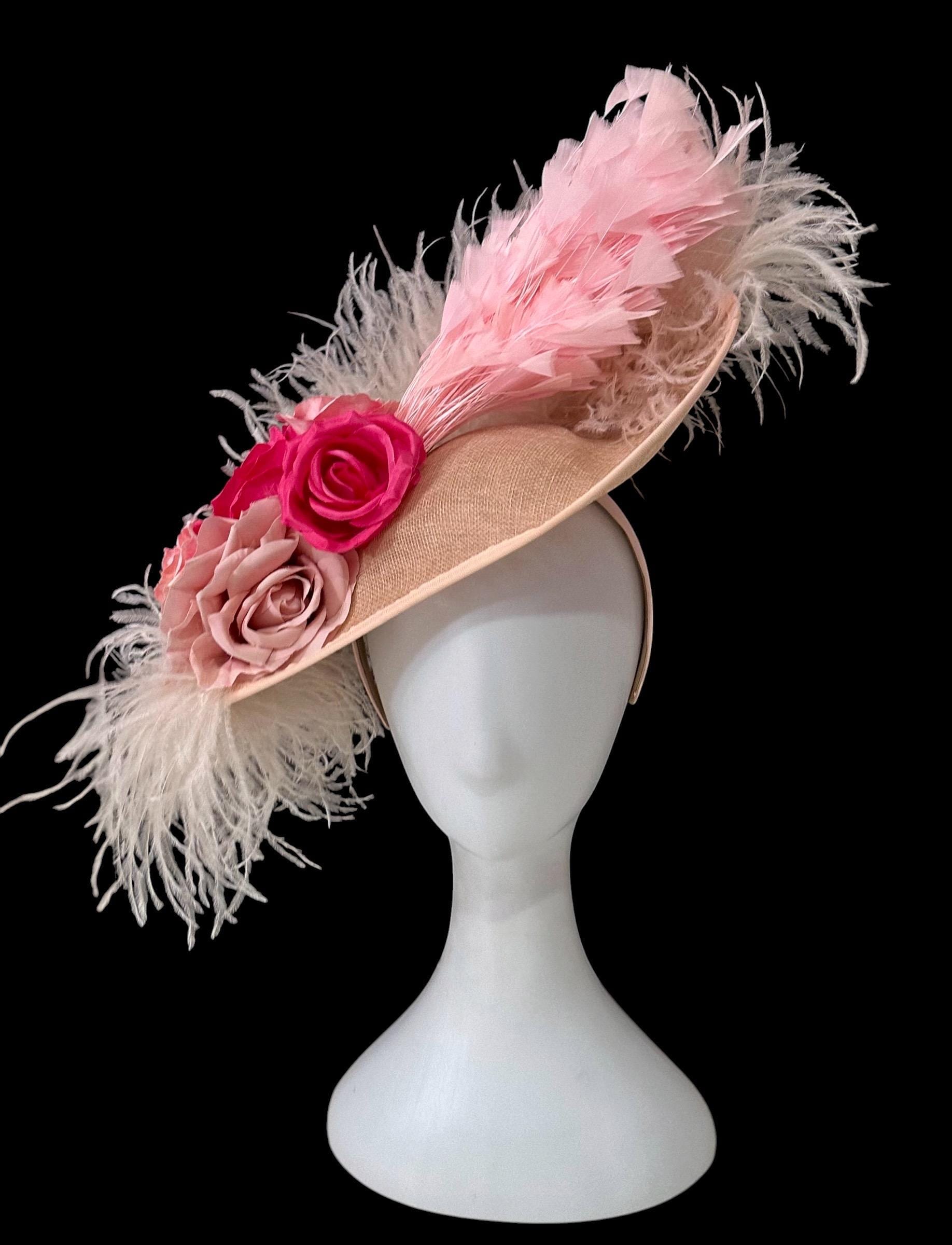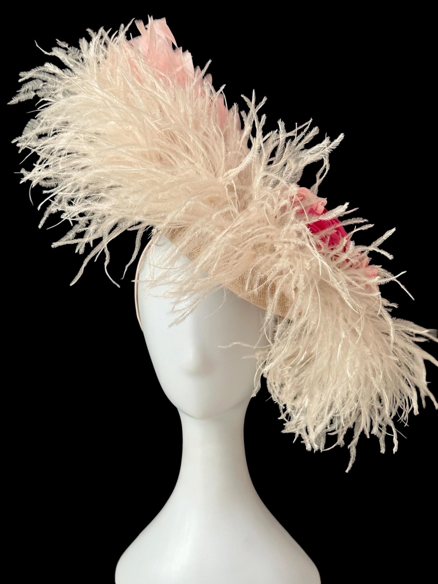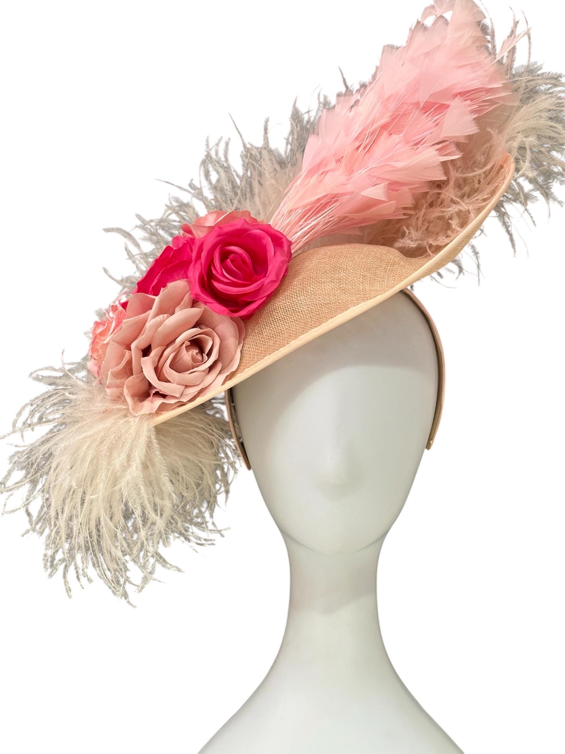 Beautiful 3D Double sided Derby Fascinator Hat, Dusty Blush Pink Roses, Rose Pink, with Pink Coque Feathers, with Your Choice...... 8 ply Ostrich Feather Champagne Beige Feather ( hint of pink) or