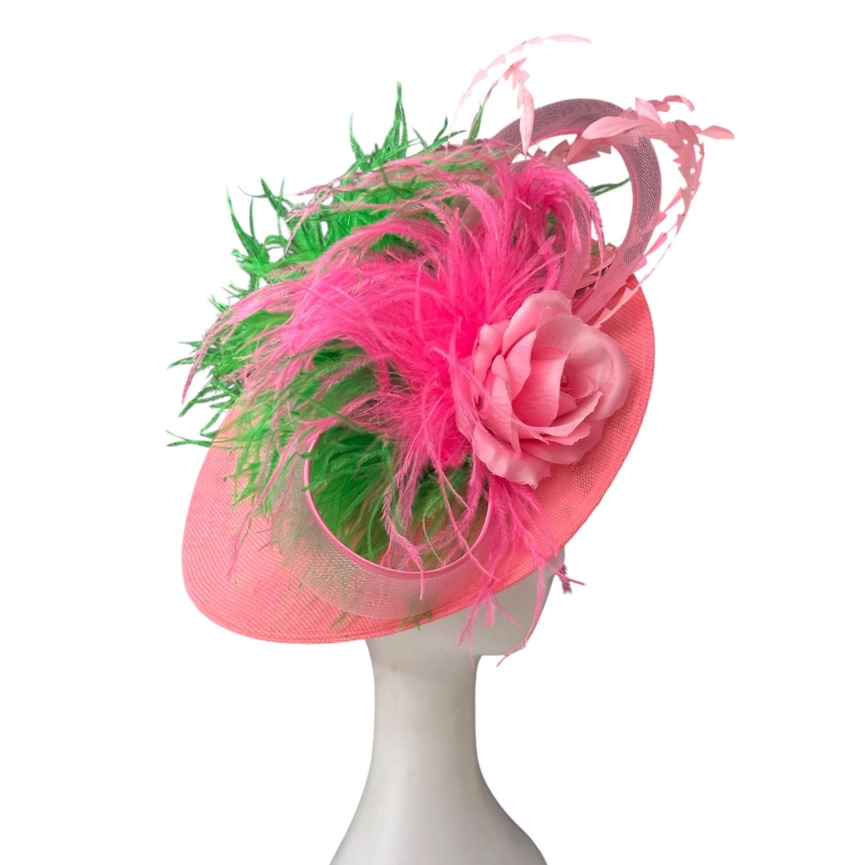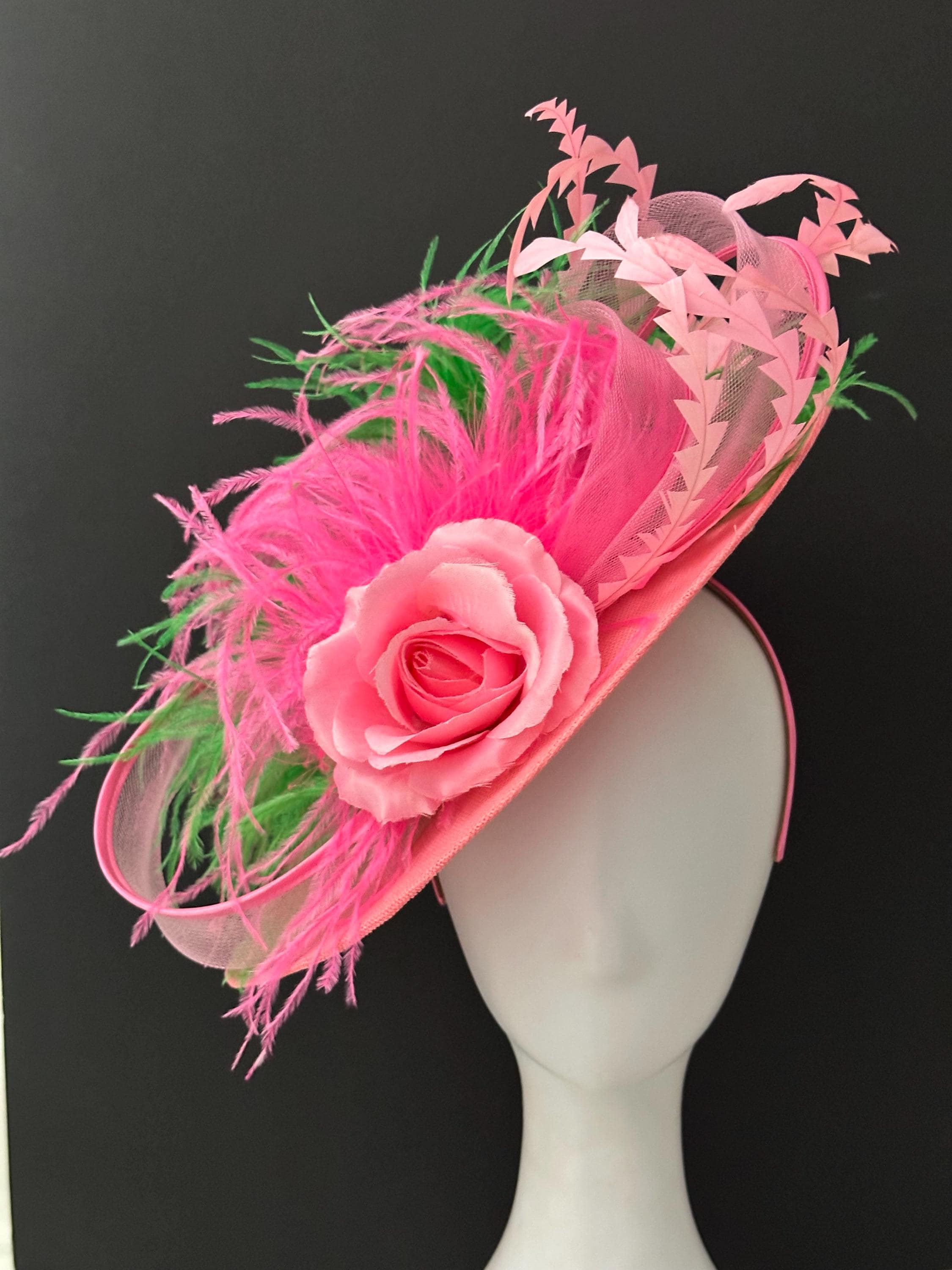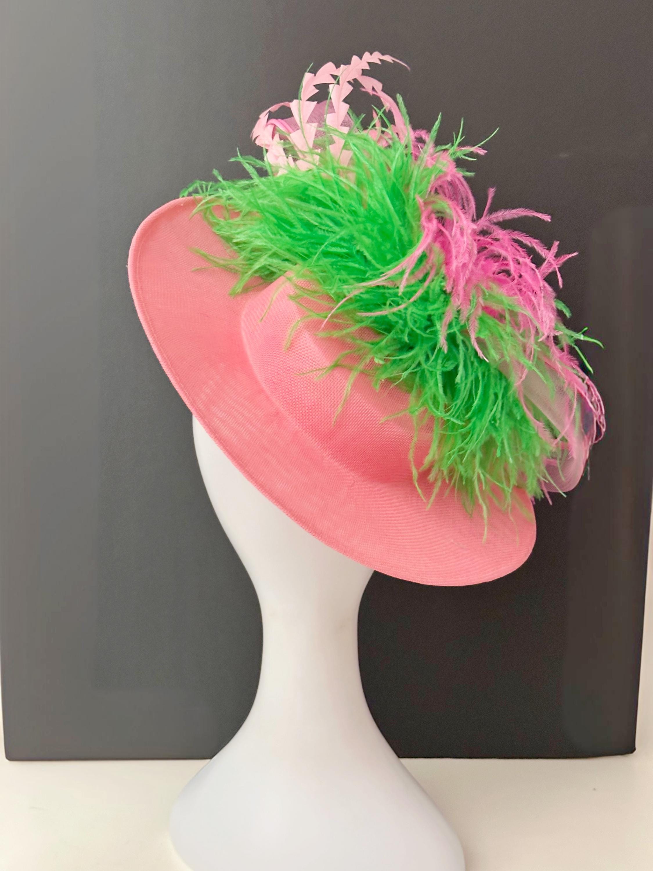 Beautiful Green Big Brim, with Pink Green Handcut crinkle long Feathers with 8 ply Ostrich marabou feather.